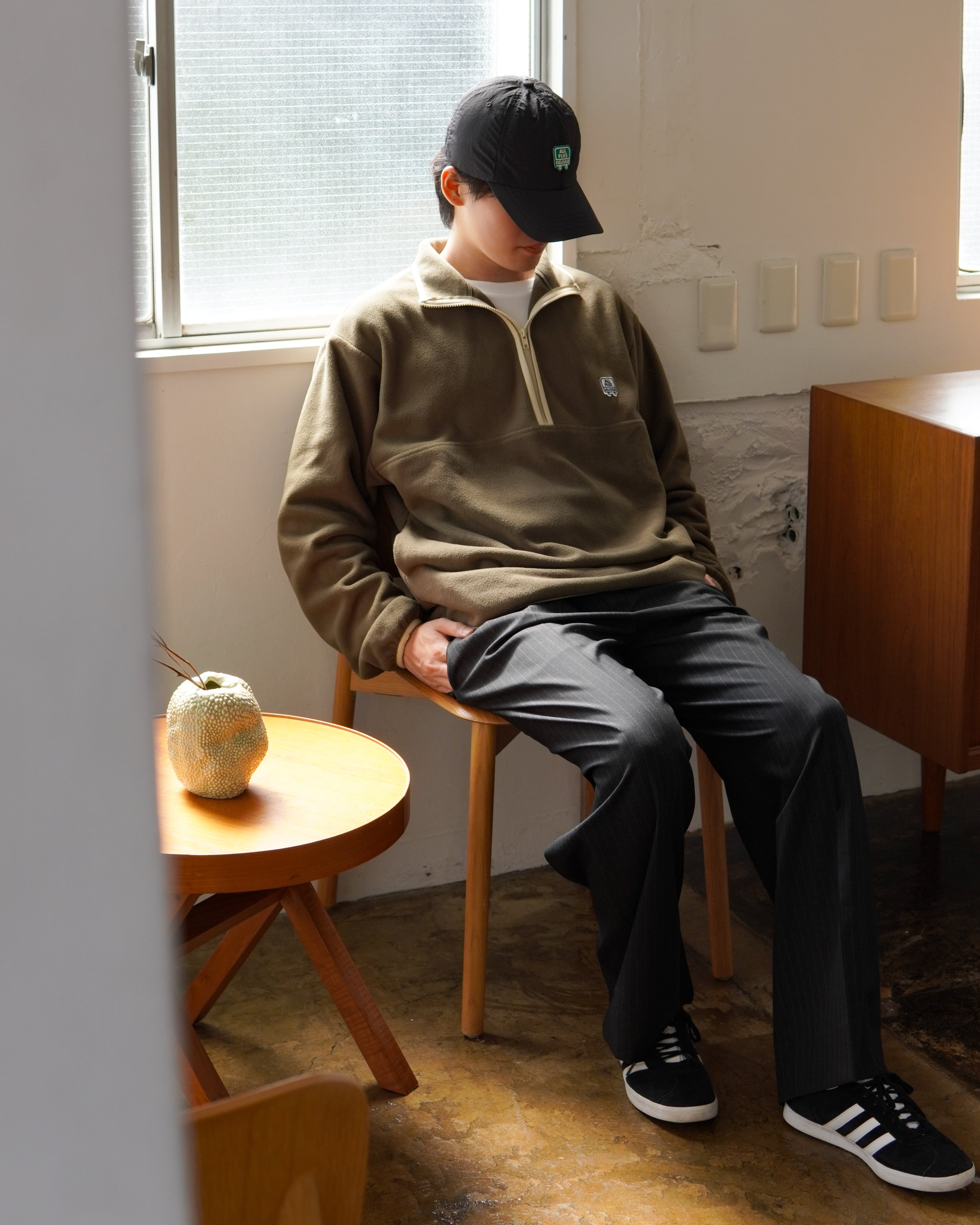 ブランドロゴをワッペンで落とし込んだ、フリース素材のハーフジップ。
