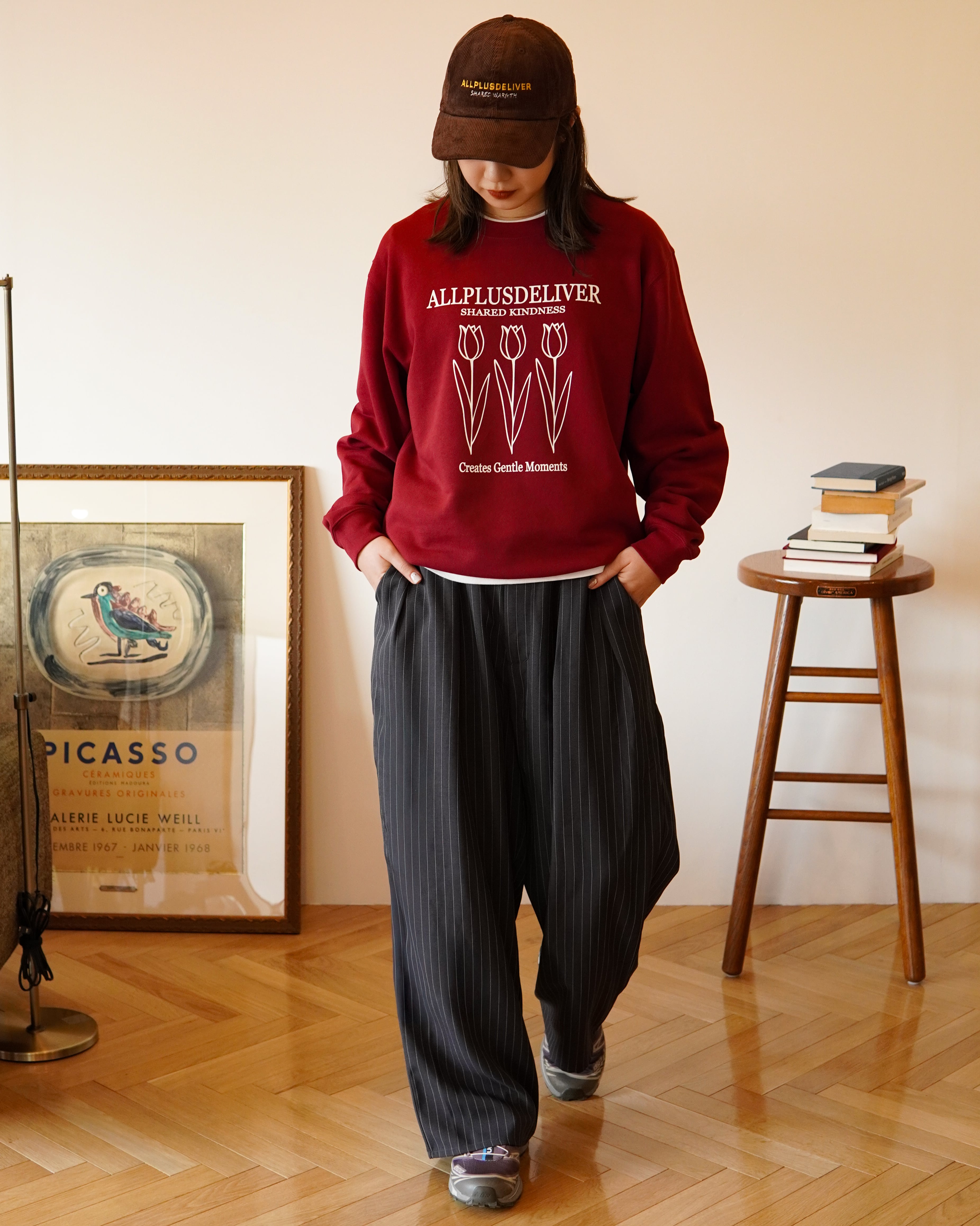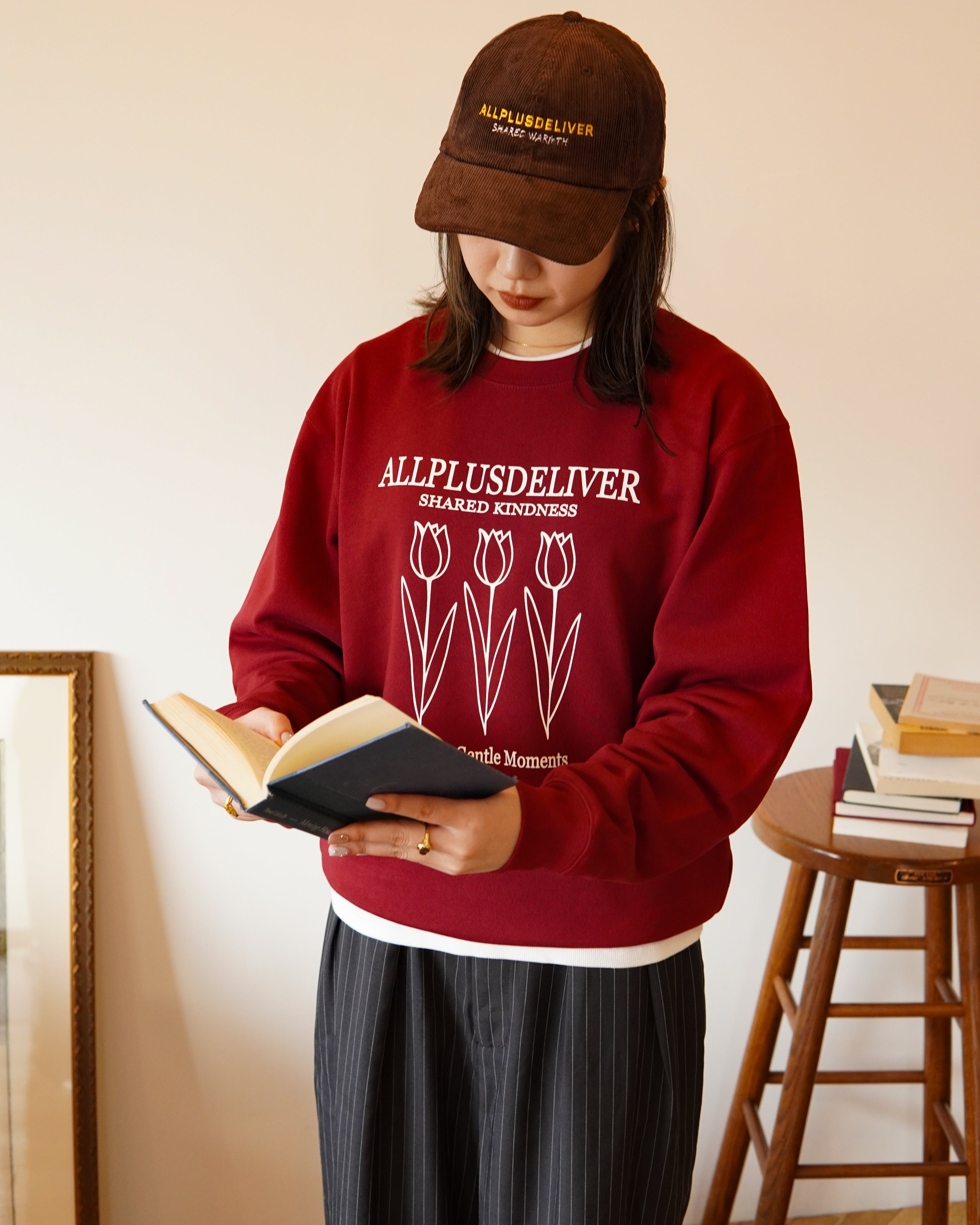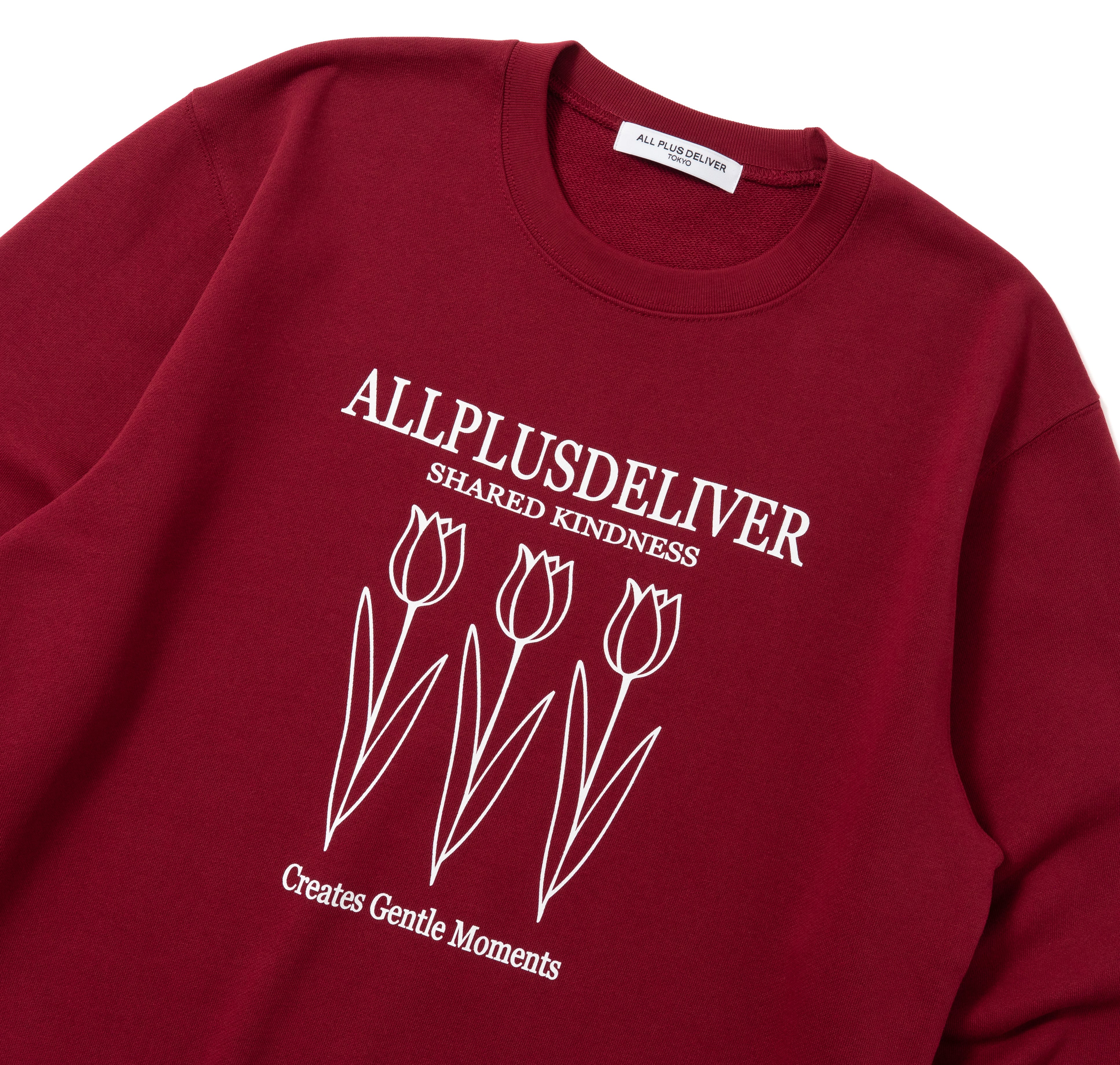 ブランドネームと、象徴であるチューリップをプリントで落とし込んだクルーネックスウェット。