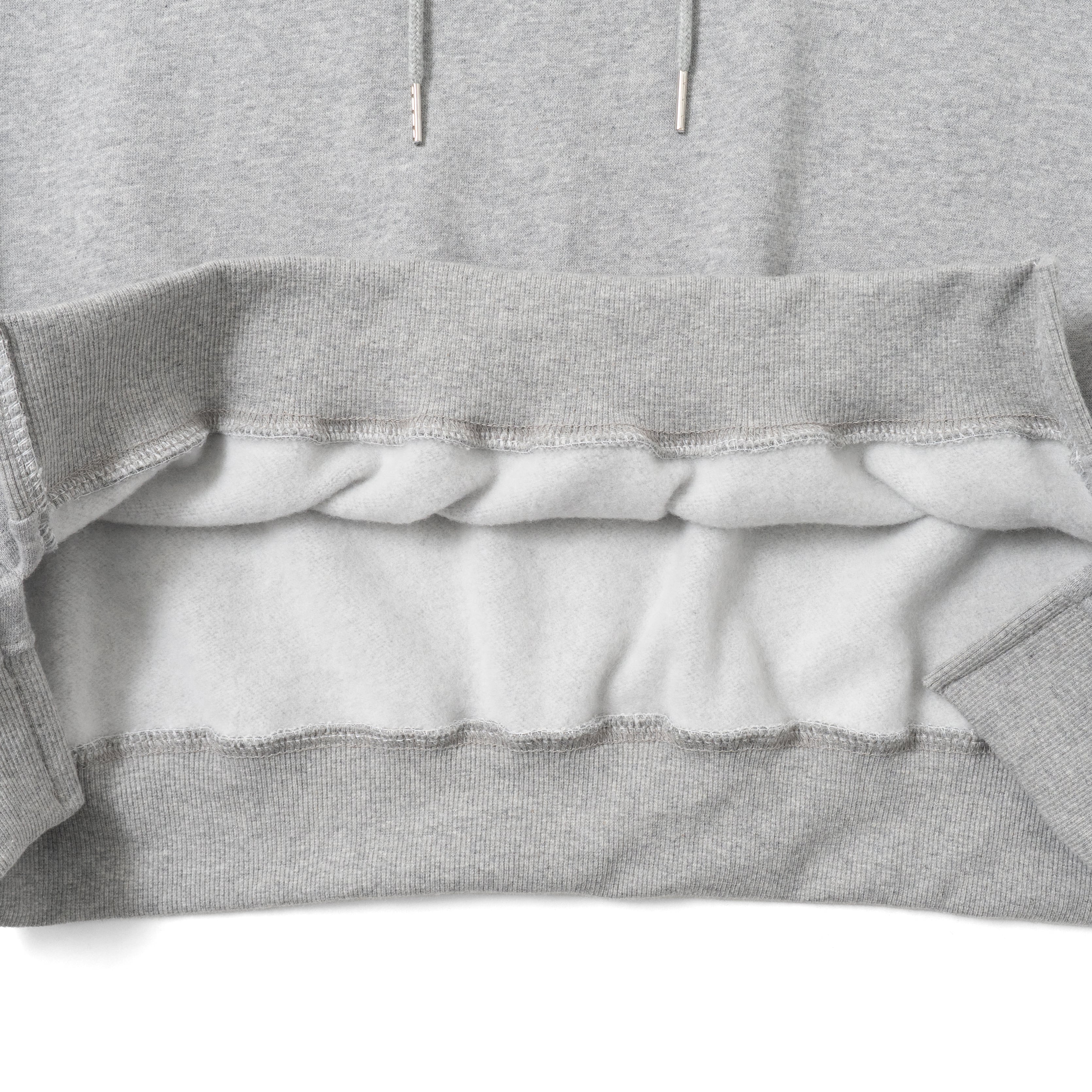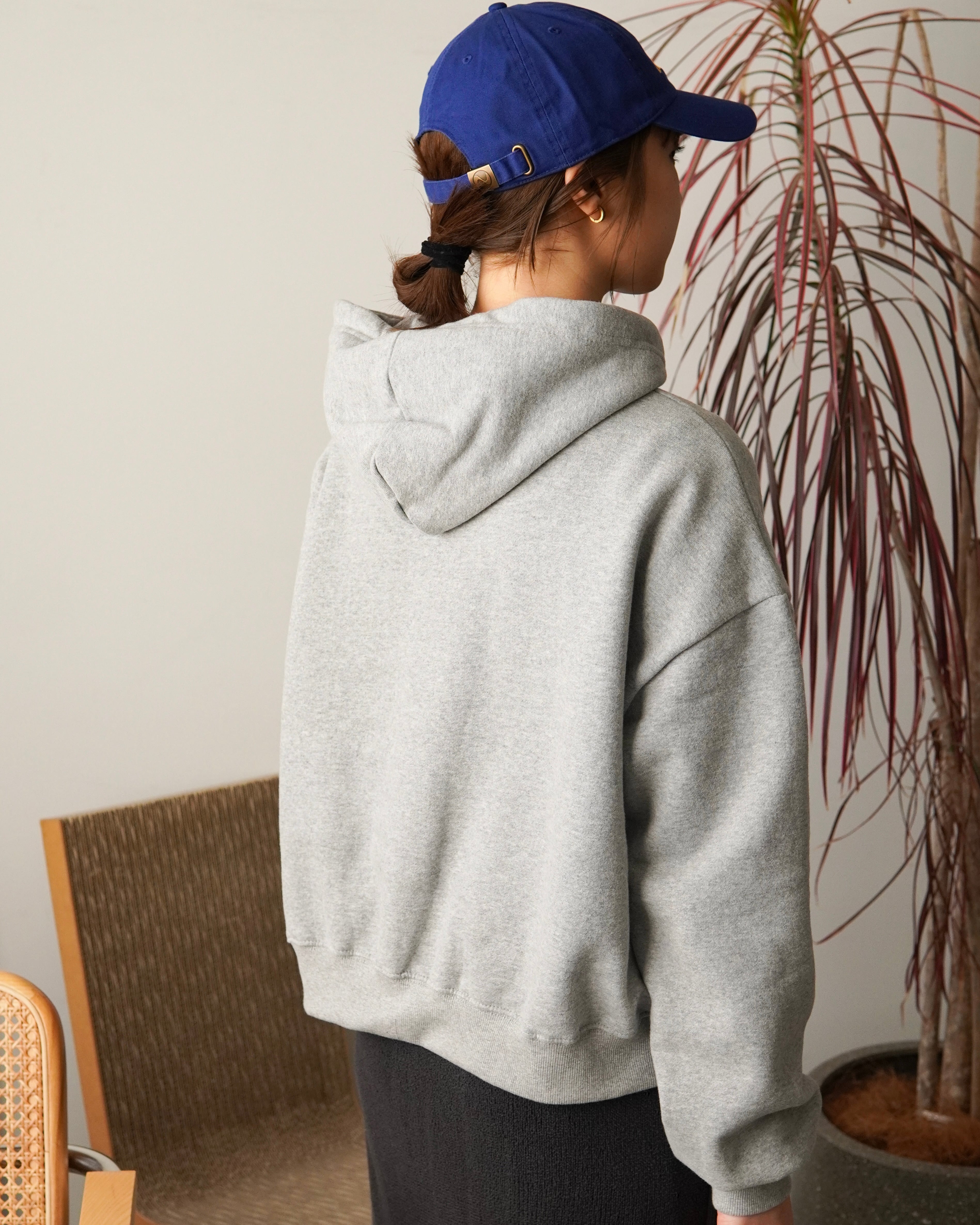 コットン100%でハリと柔らかさのバランスが良く、デイリーに着やすいミドルウェイト生地を使用。裏起毛ならではの暖かさと、肌当たりの優しい着心地がポイントです。
