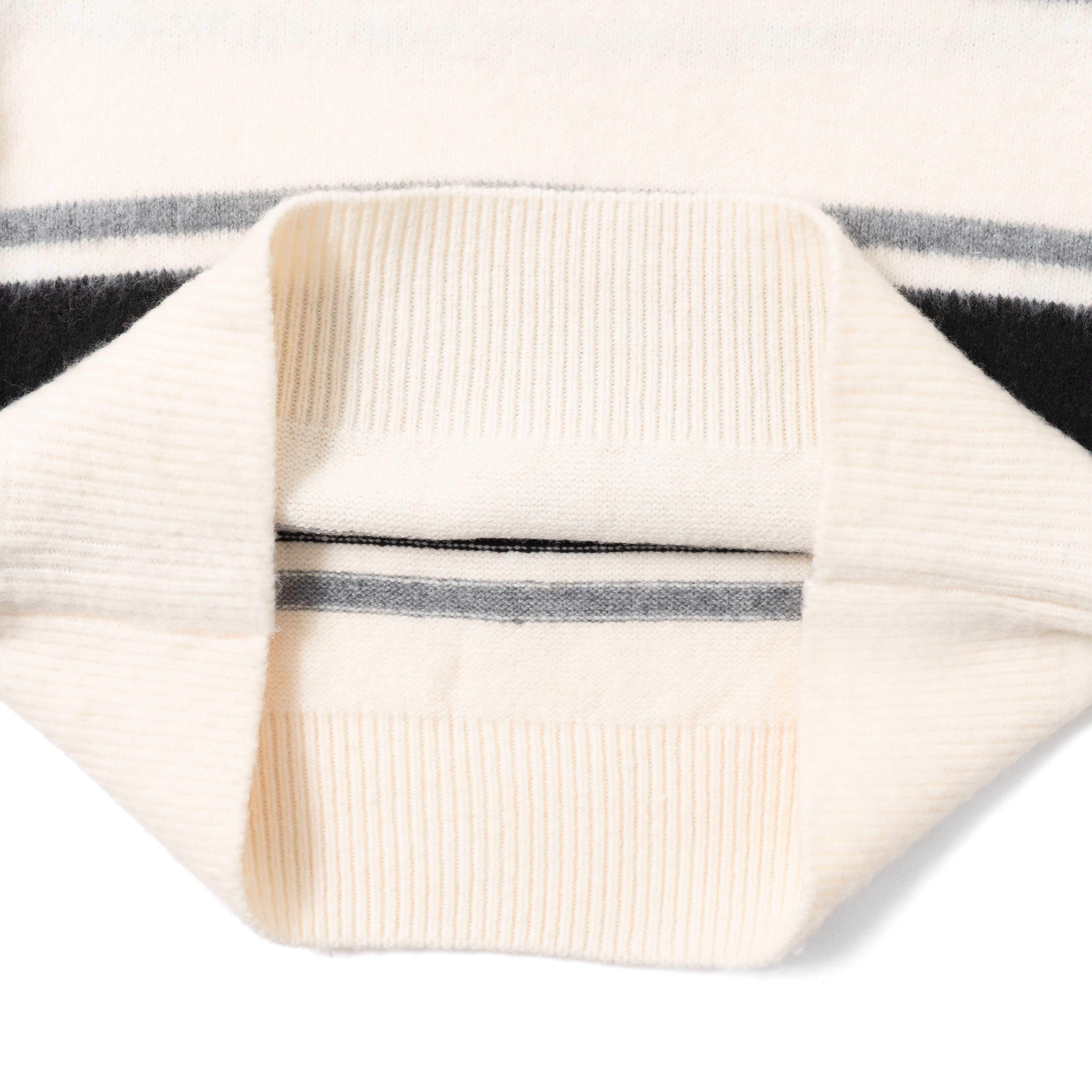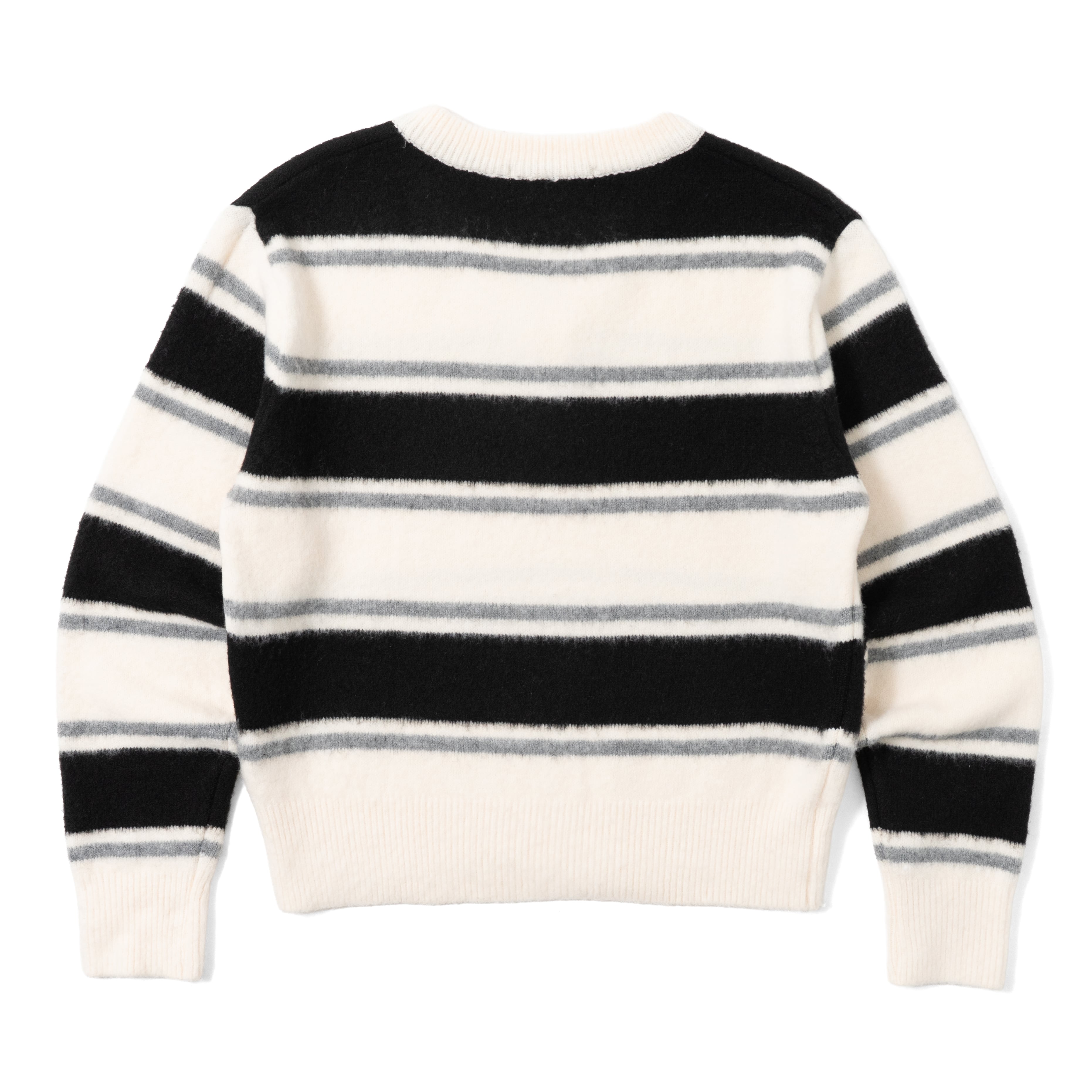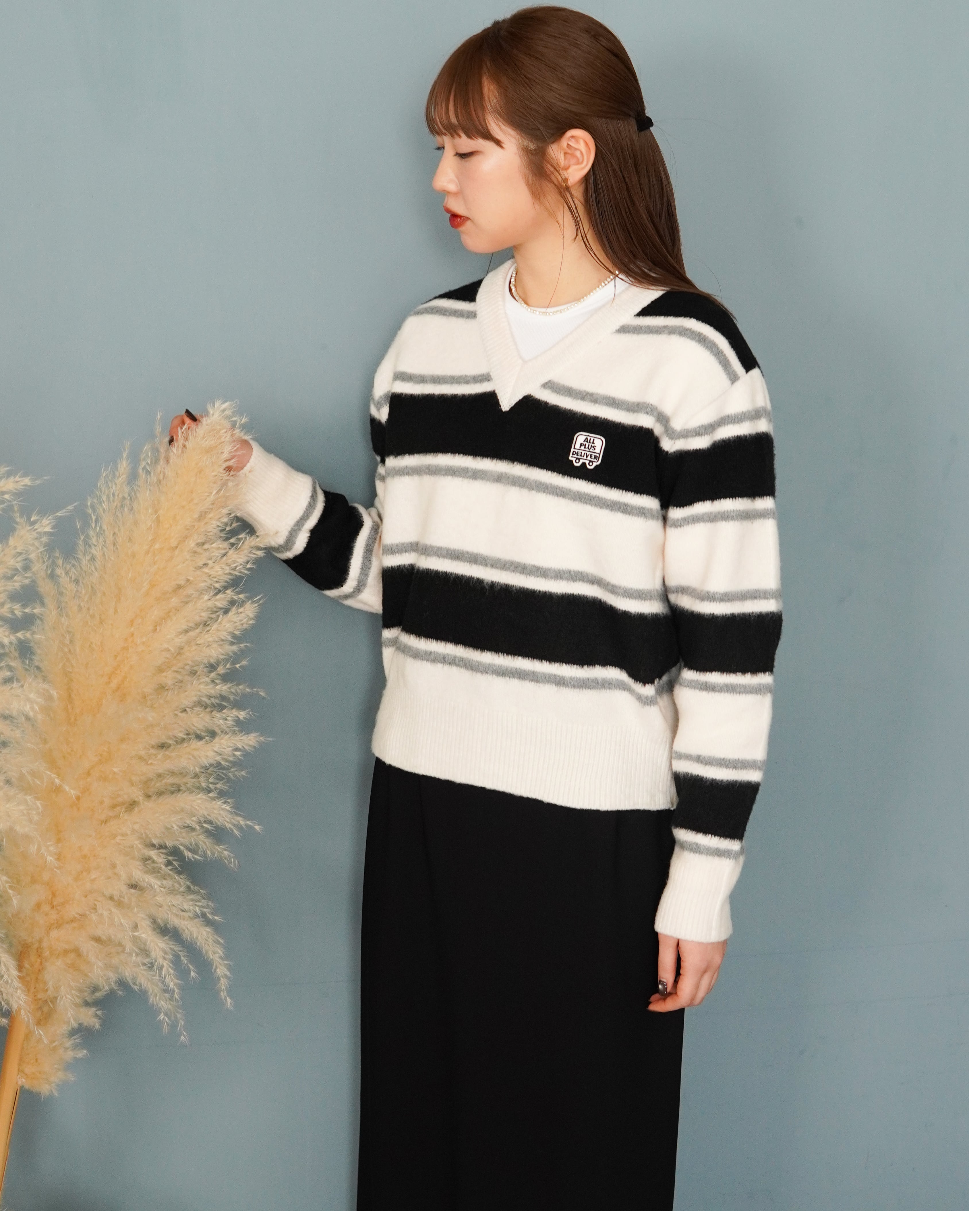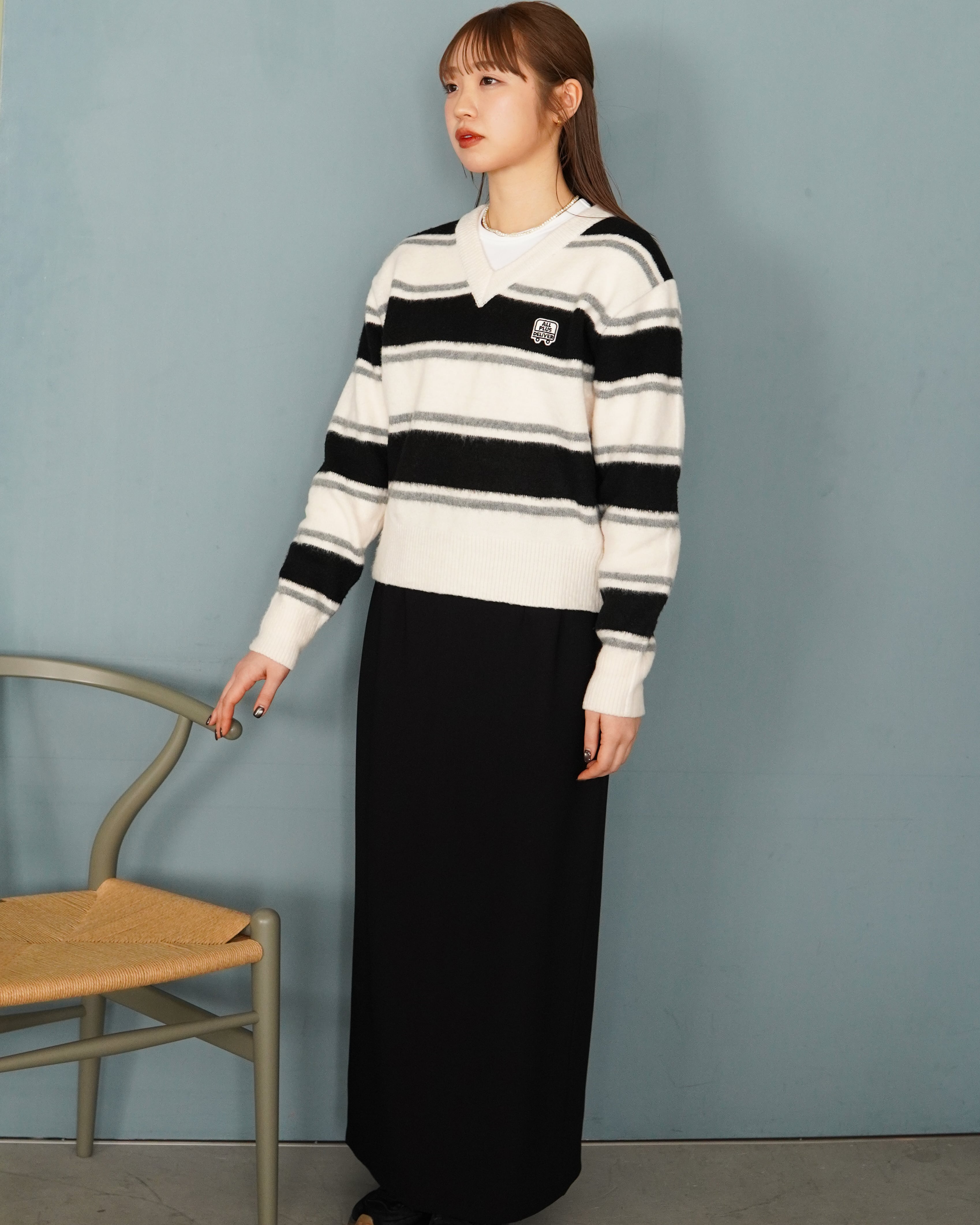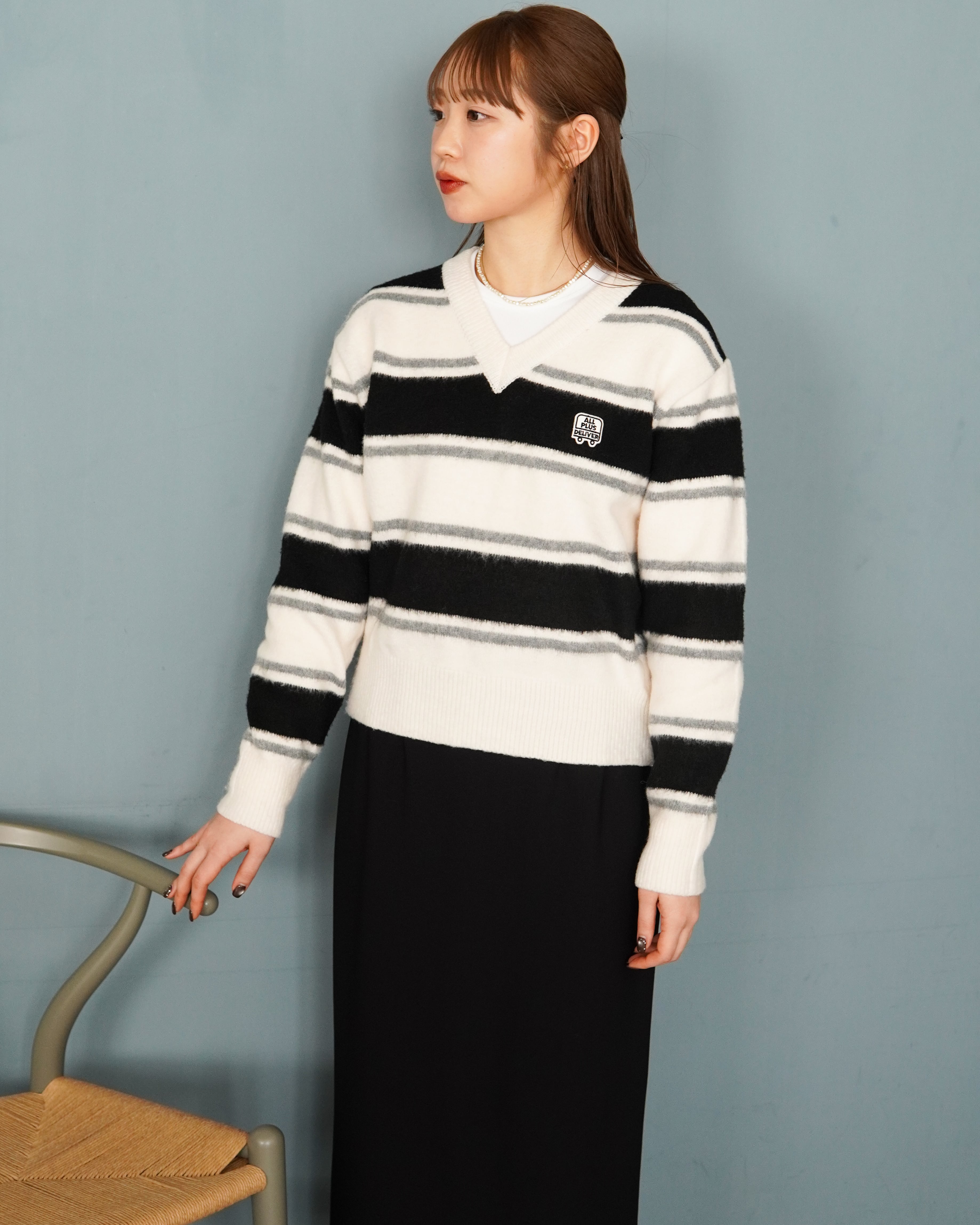 ブランドロゴをワッペンで落とし込んだ、Vネックボーダーニットです。