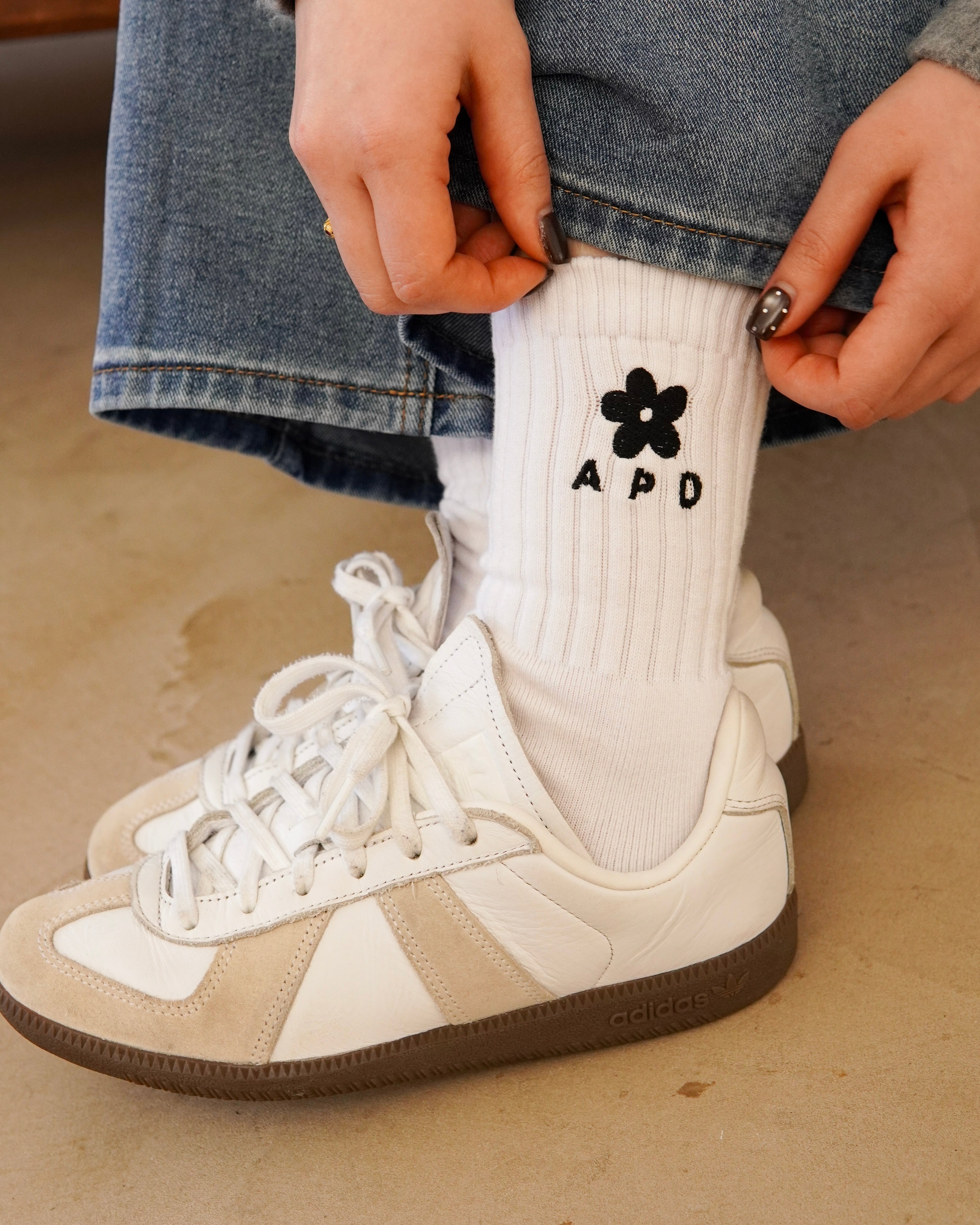 ブランドロゴとメイングラフィックの花をソックスの外側に刺繍で落とし込みました。