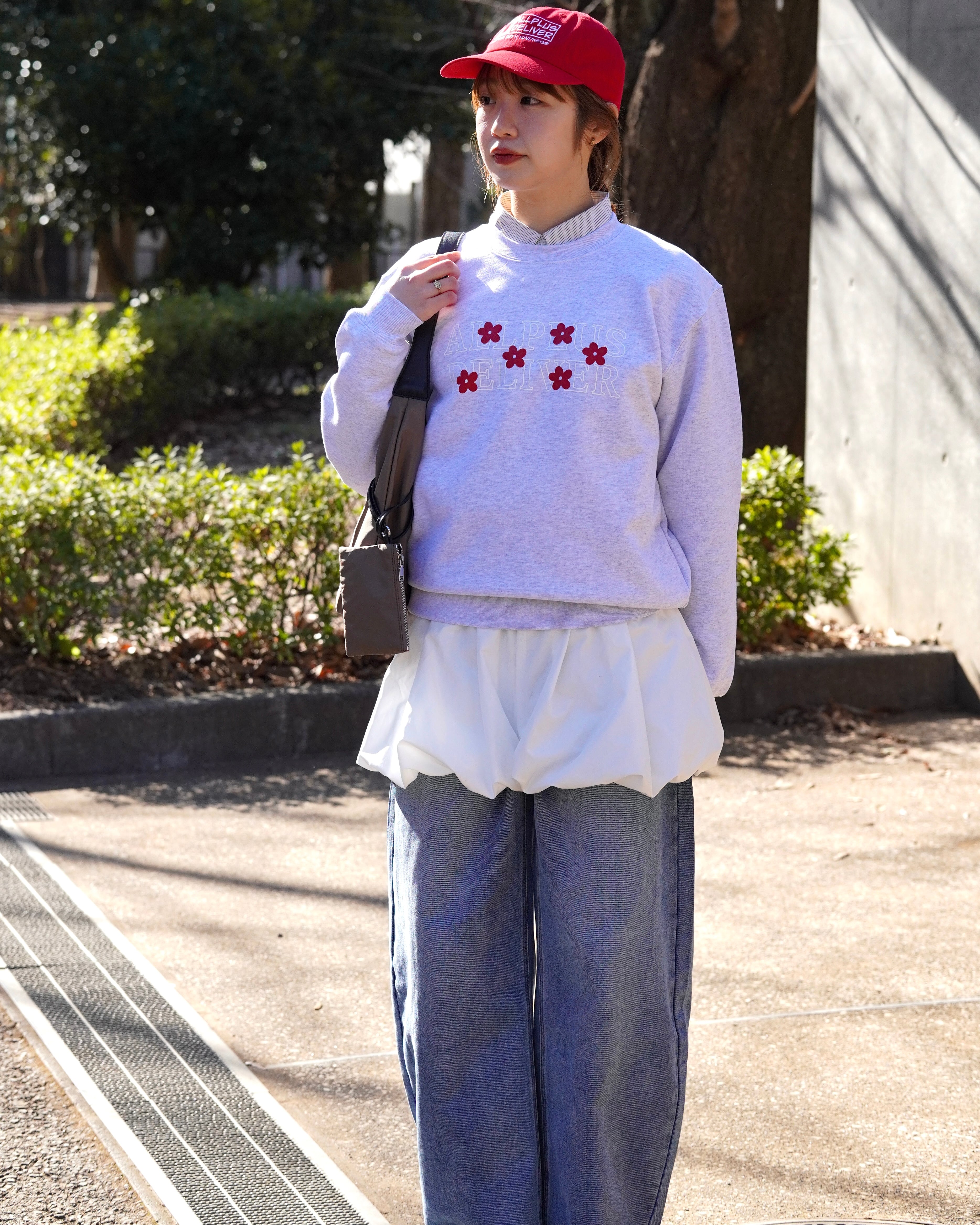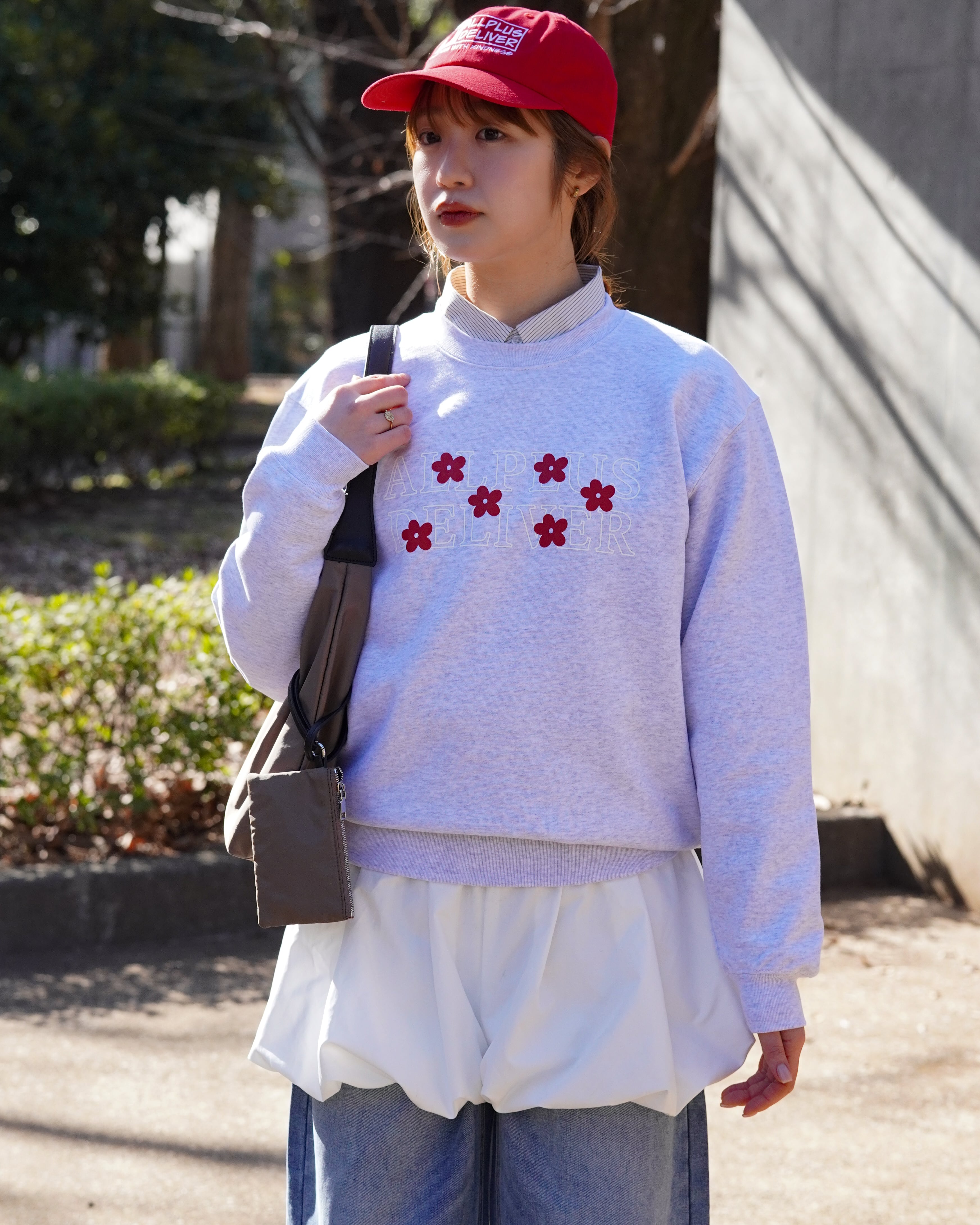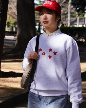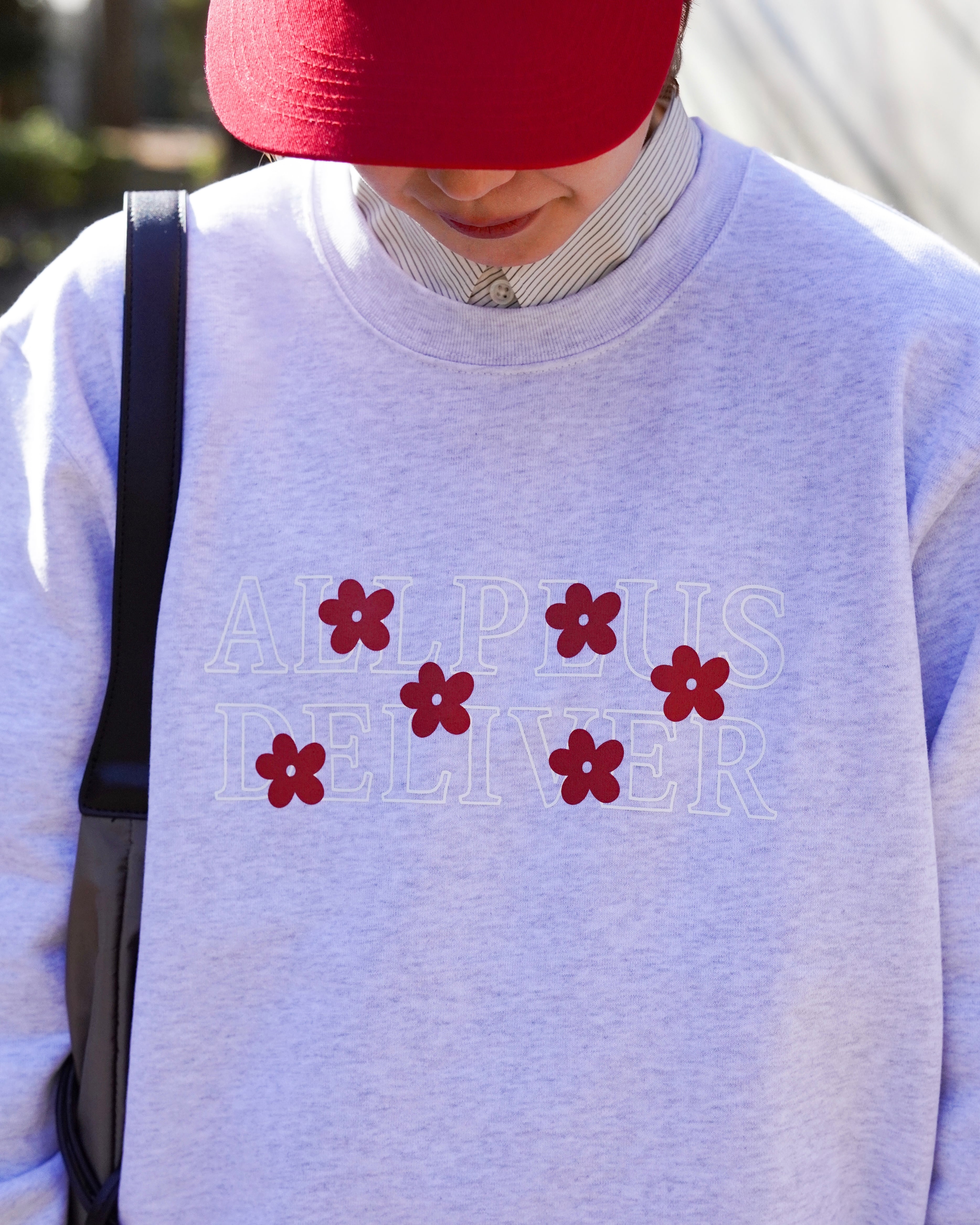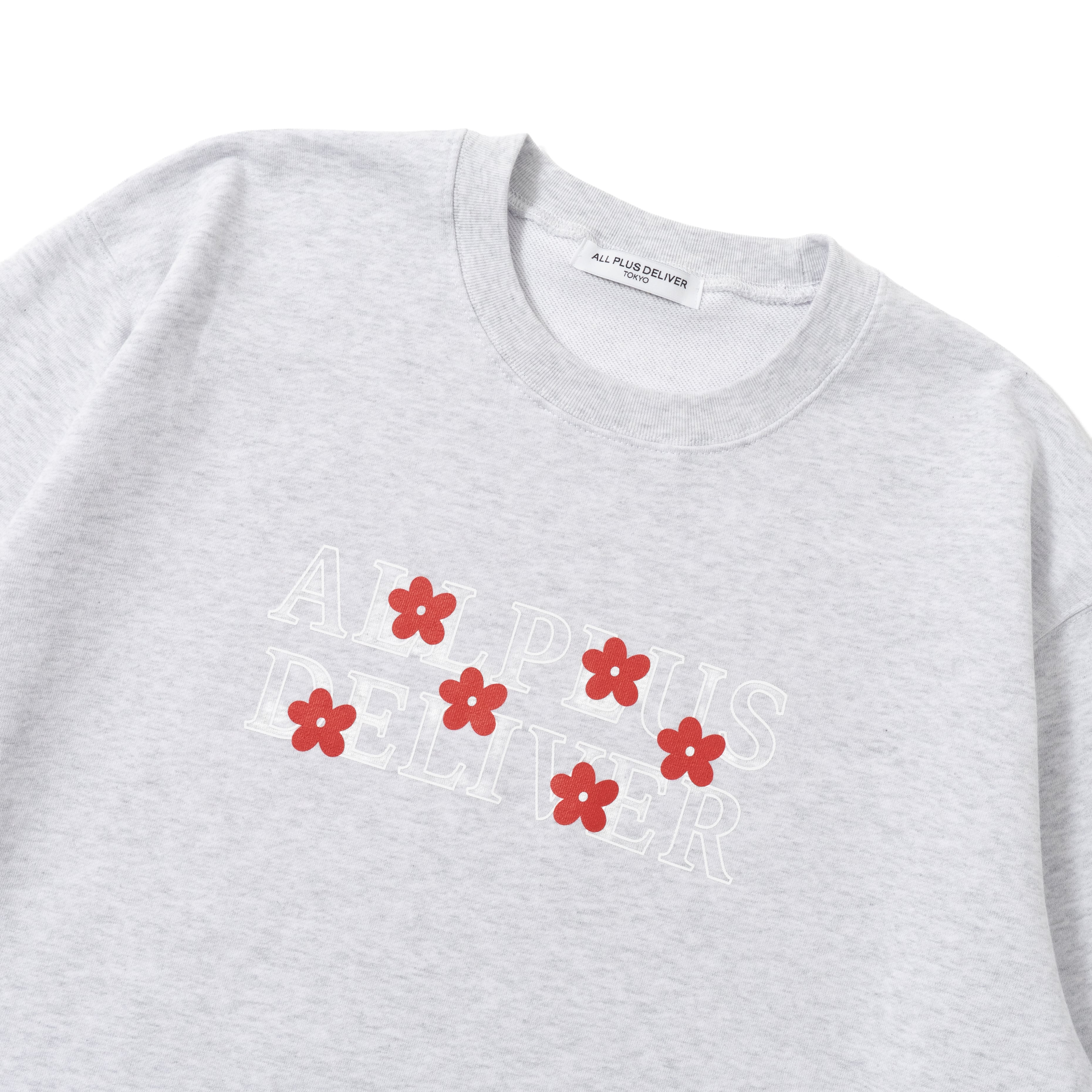 ブランドロゴにフラワーモチーフをプリントで落とし込んだ、クルーネックスウェット。
