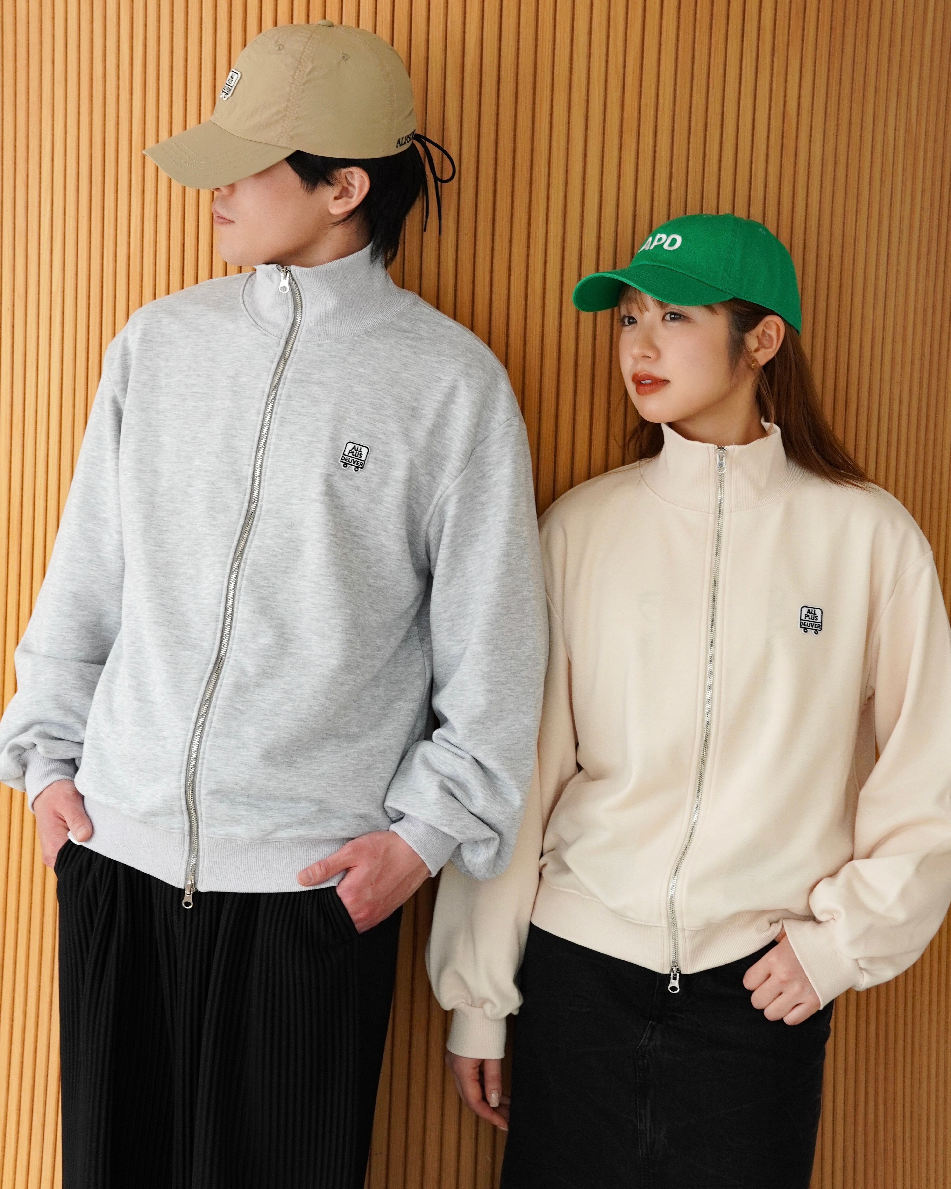ブランドロゴをワッペンで落とし込んだスタンドジップ仕様のスウェット。