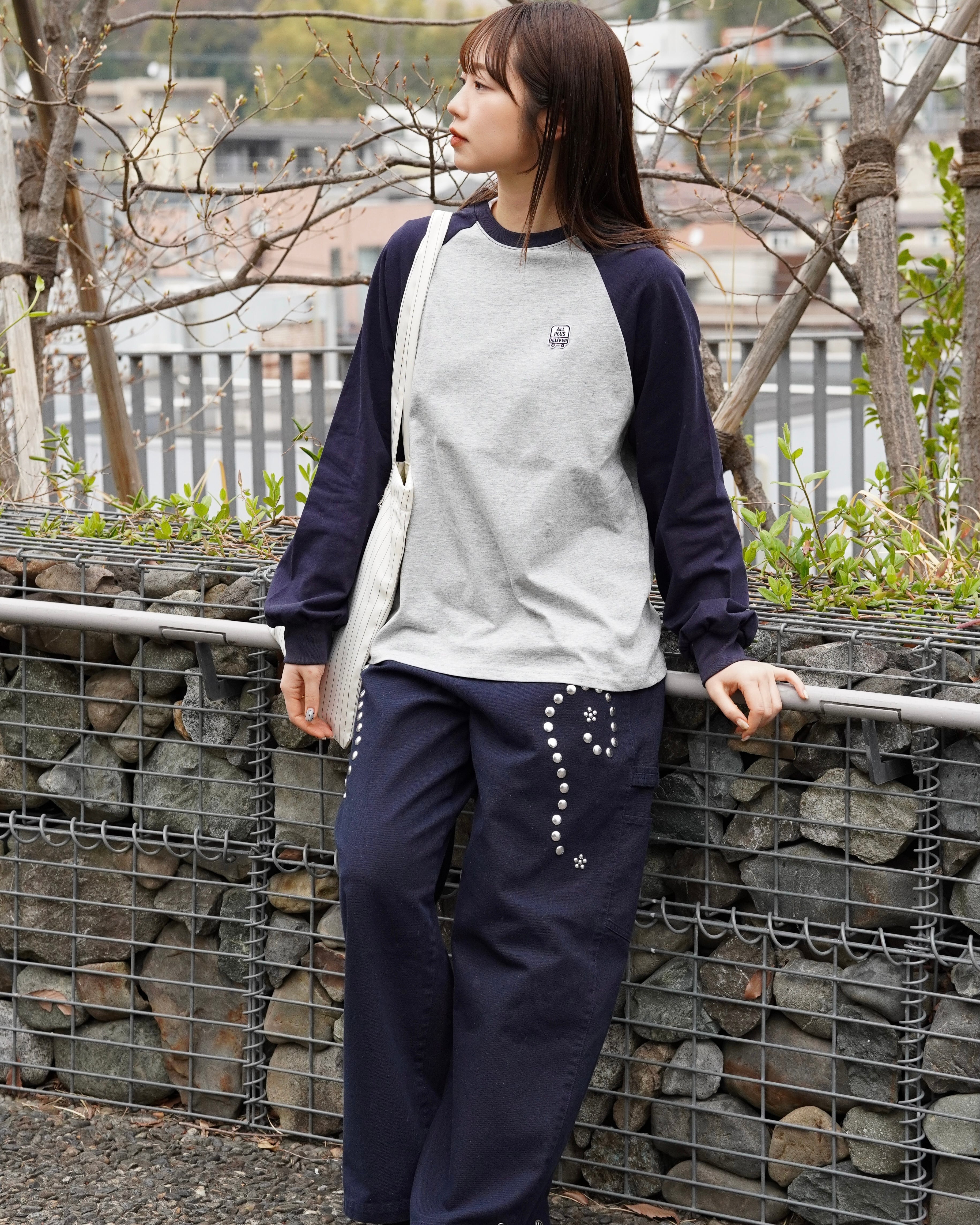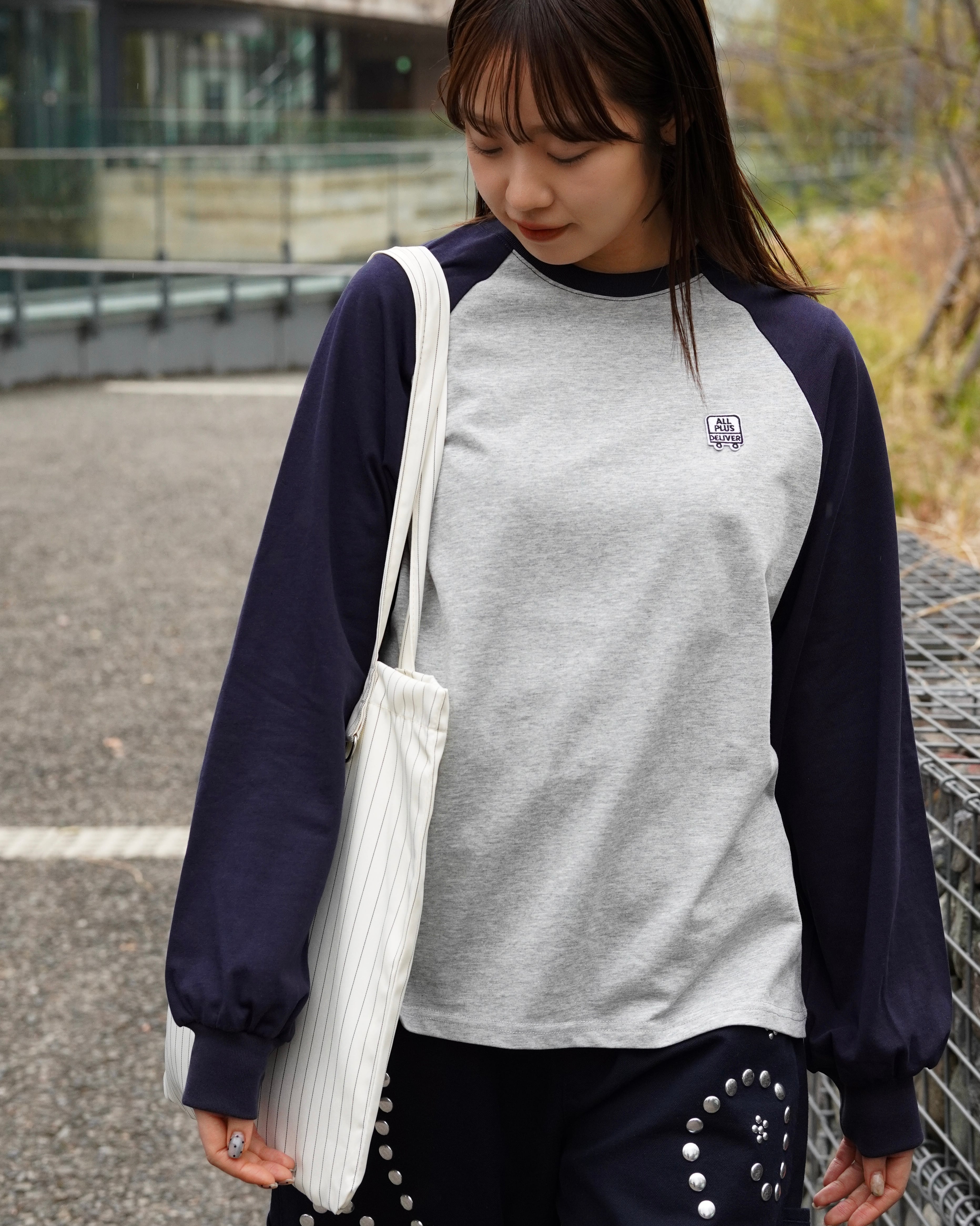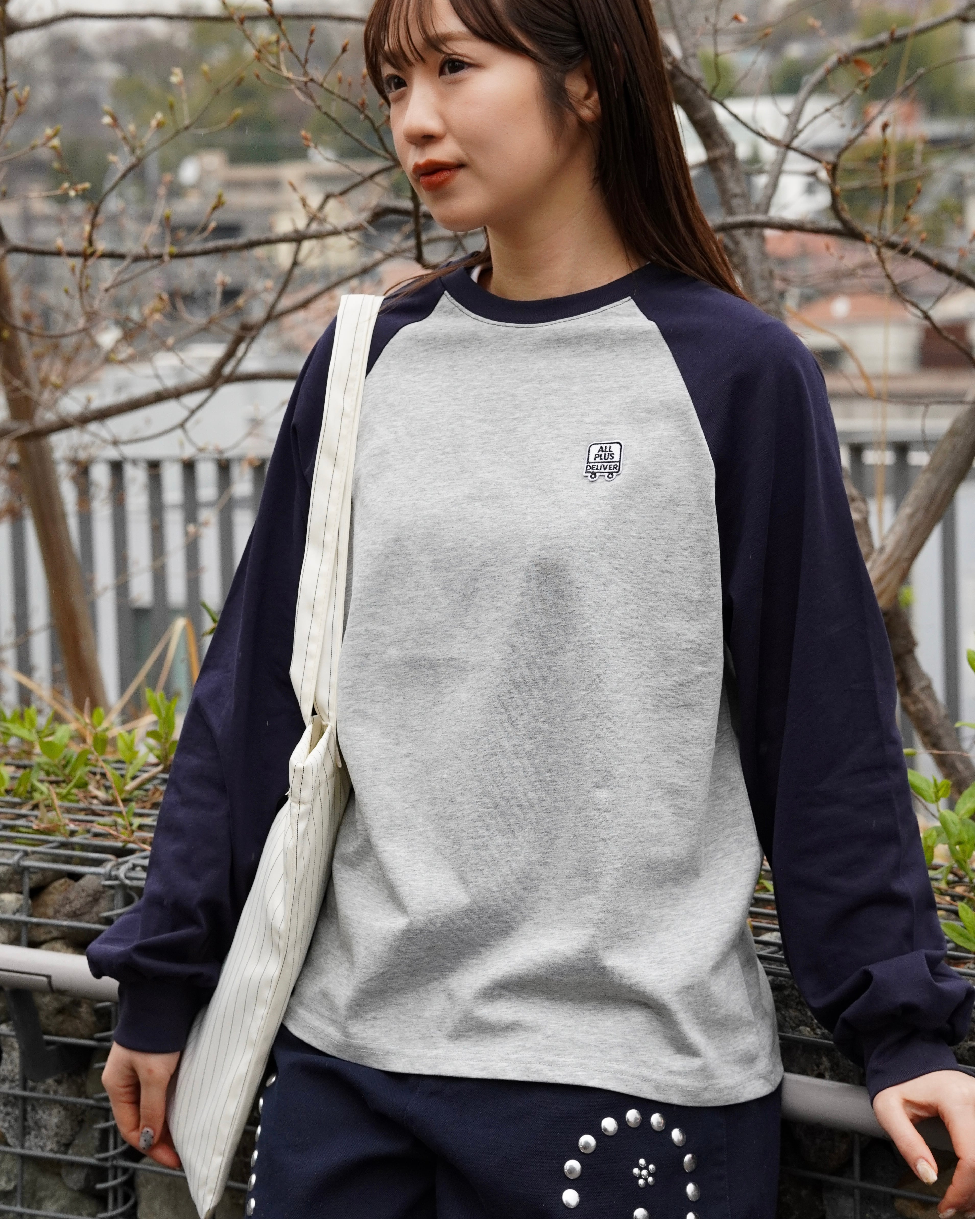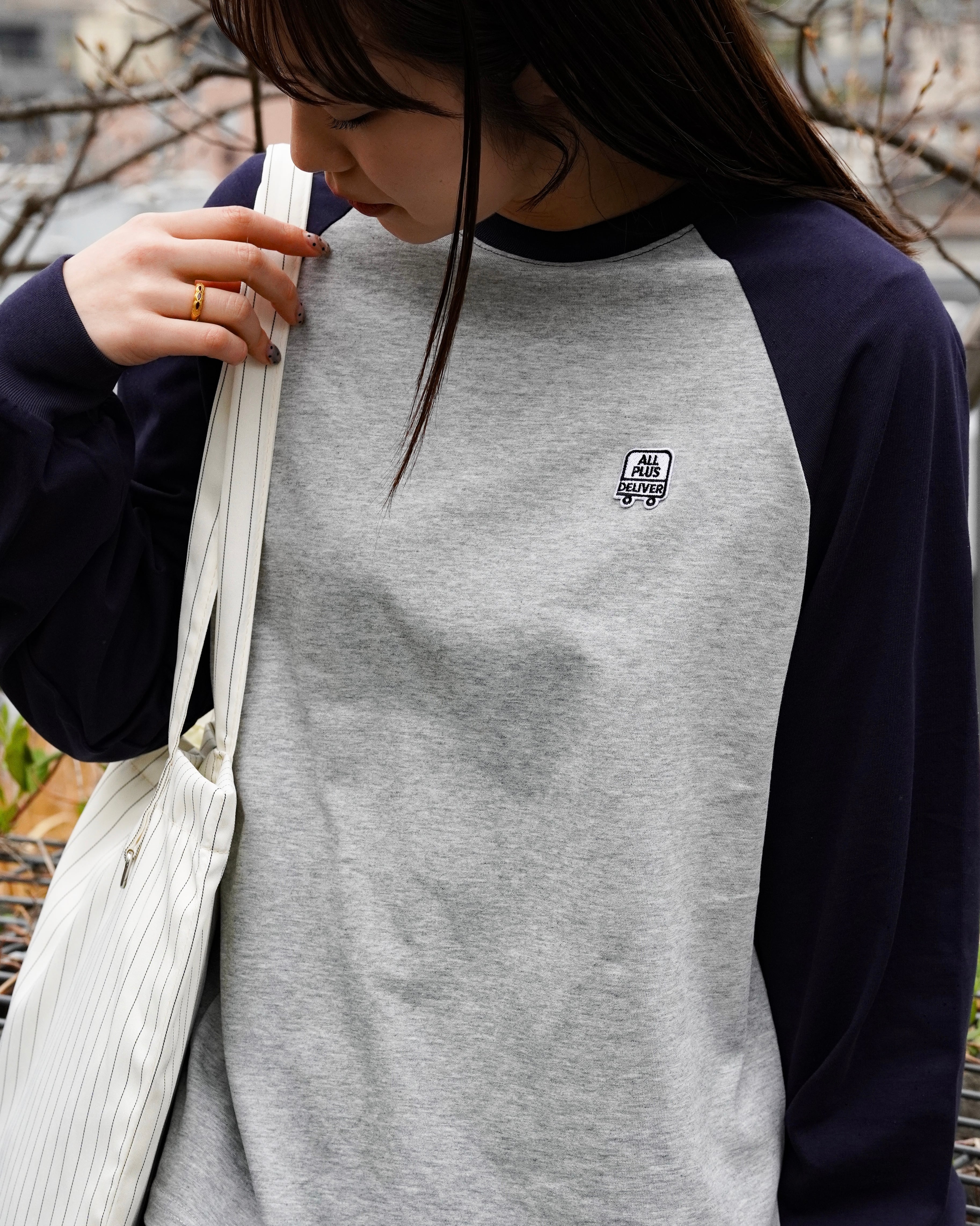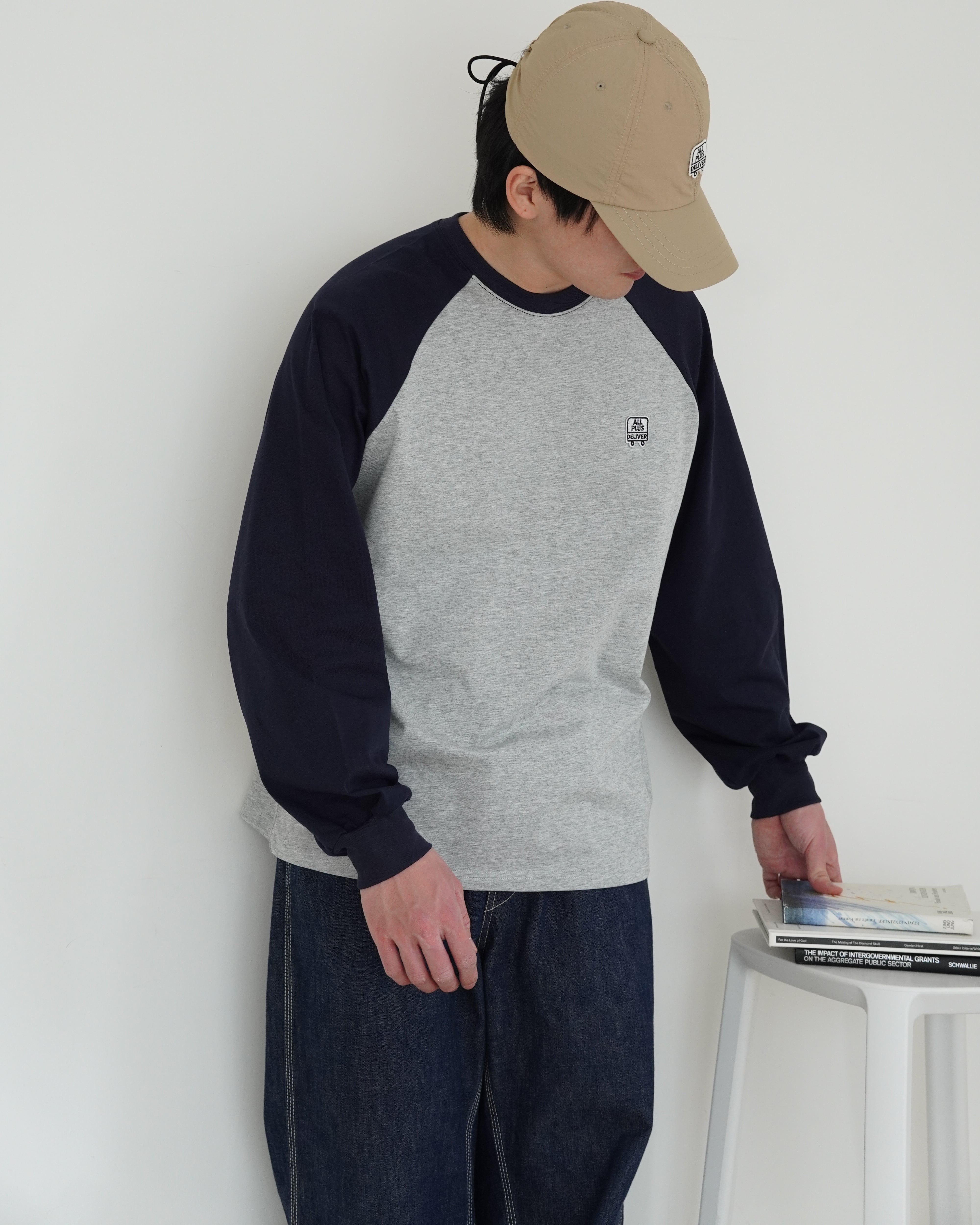 ブランドロゴをワッペンで落とし込んだ、ラグランスリーブ仕様のロングスリーブTシャツ。