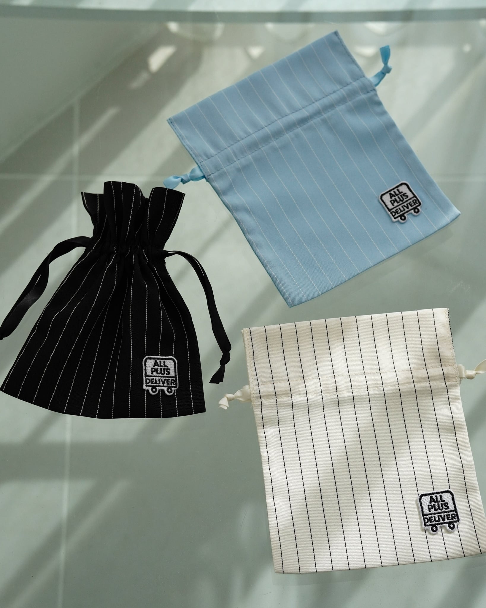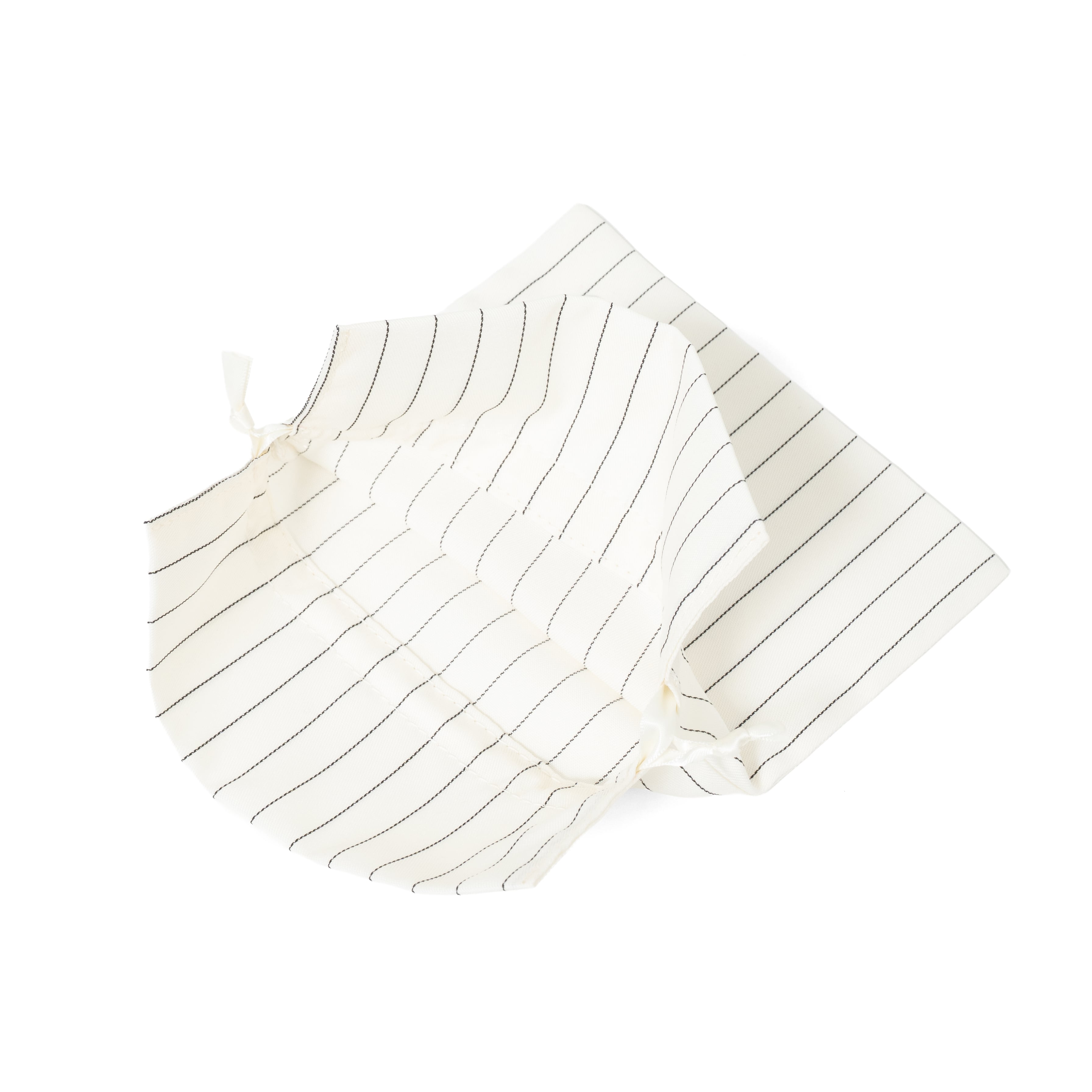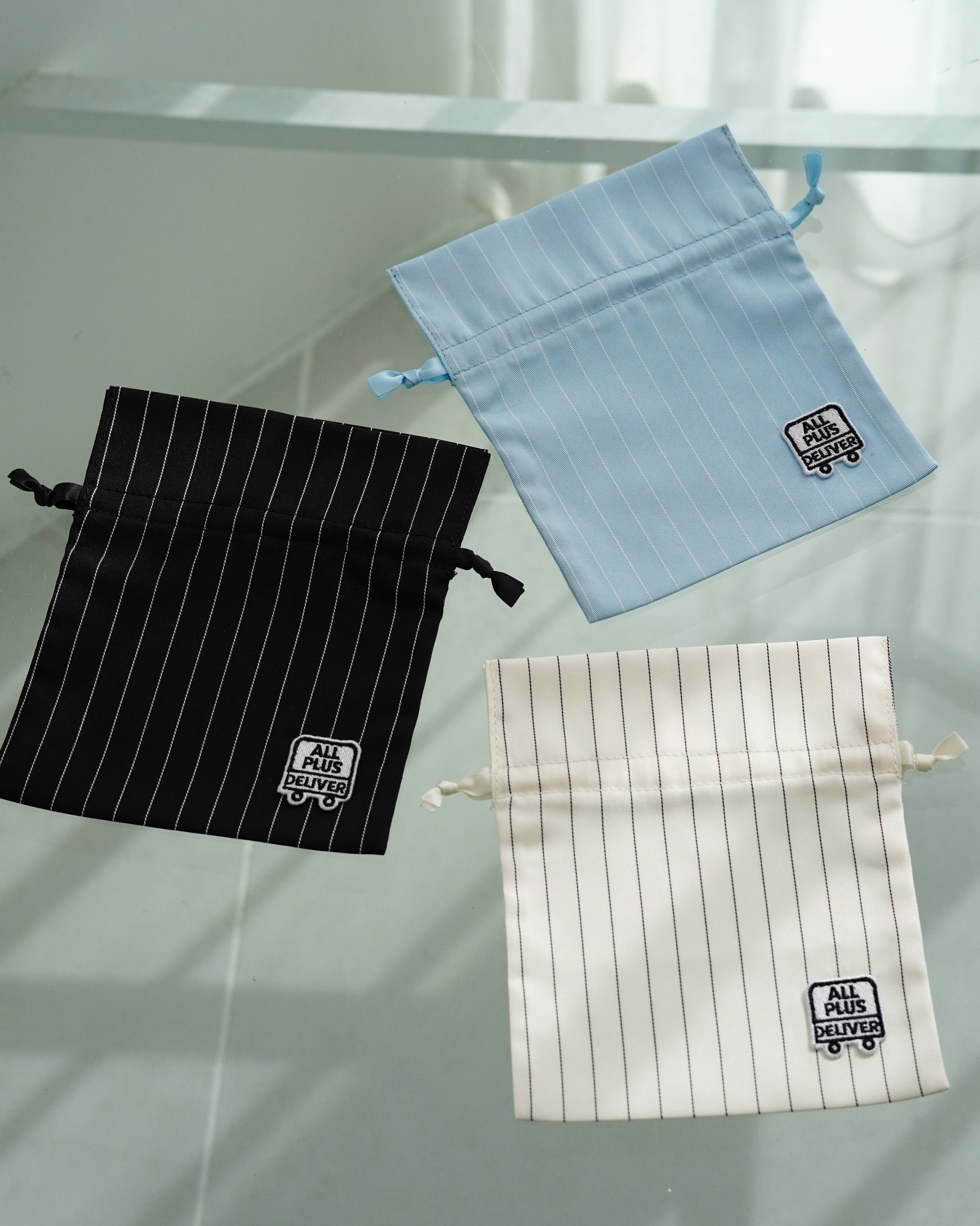 クリーンな印象のストライプ生地に、ブランドロゴをワンポイントで配置したシンプルなデザイン。
