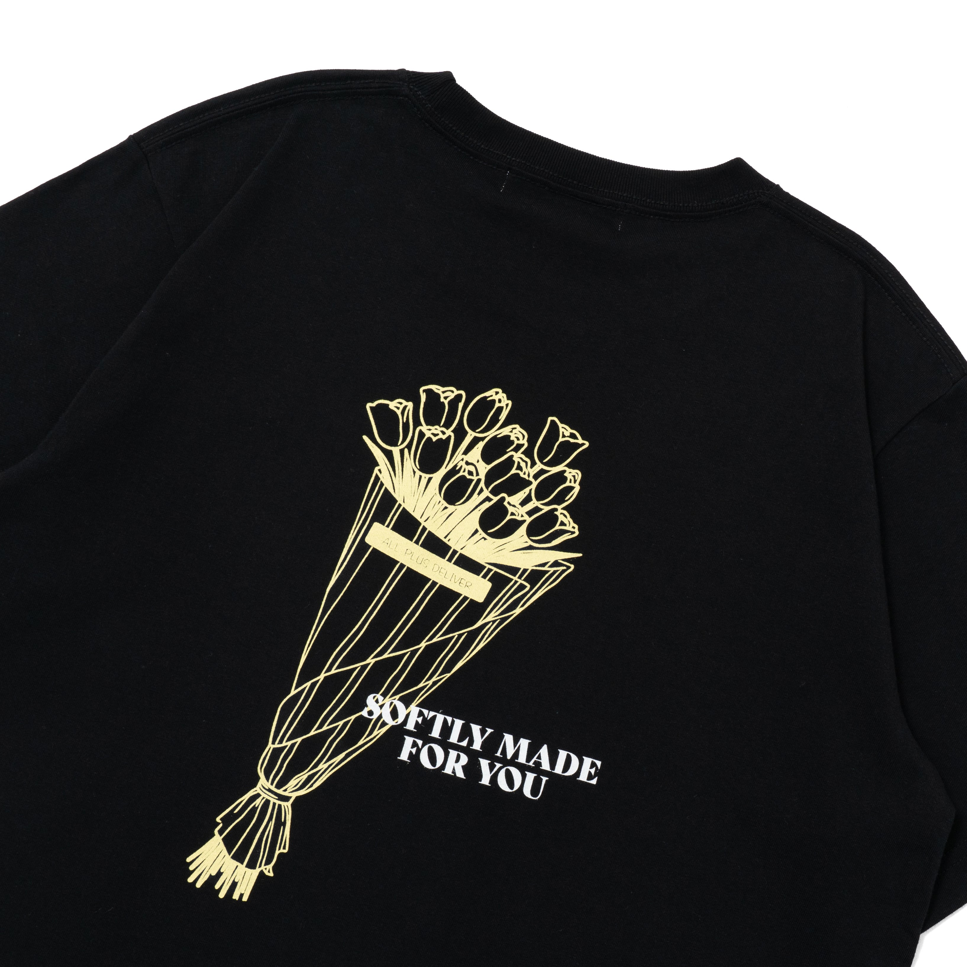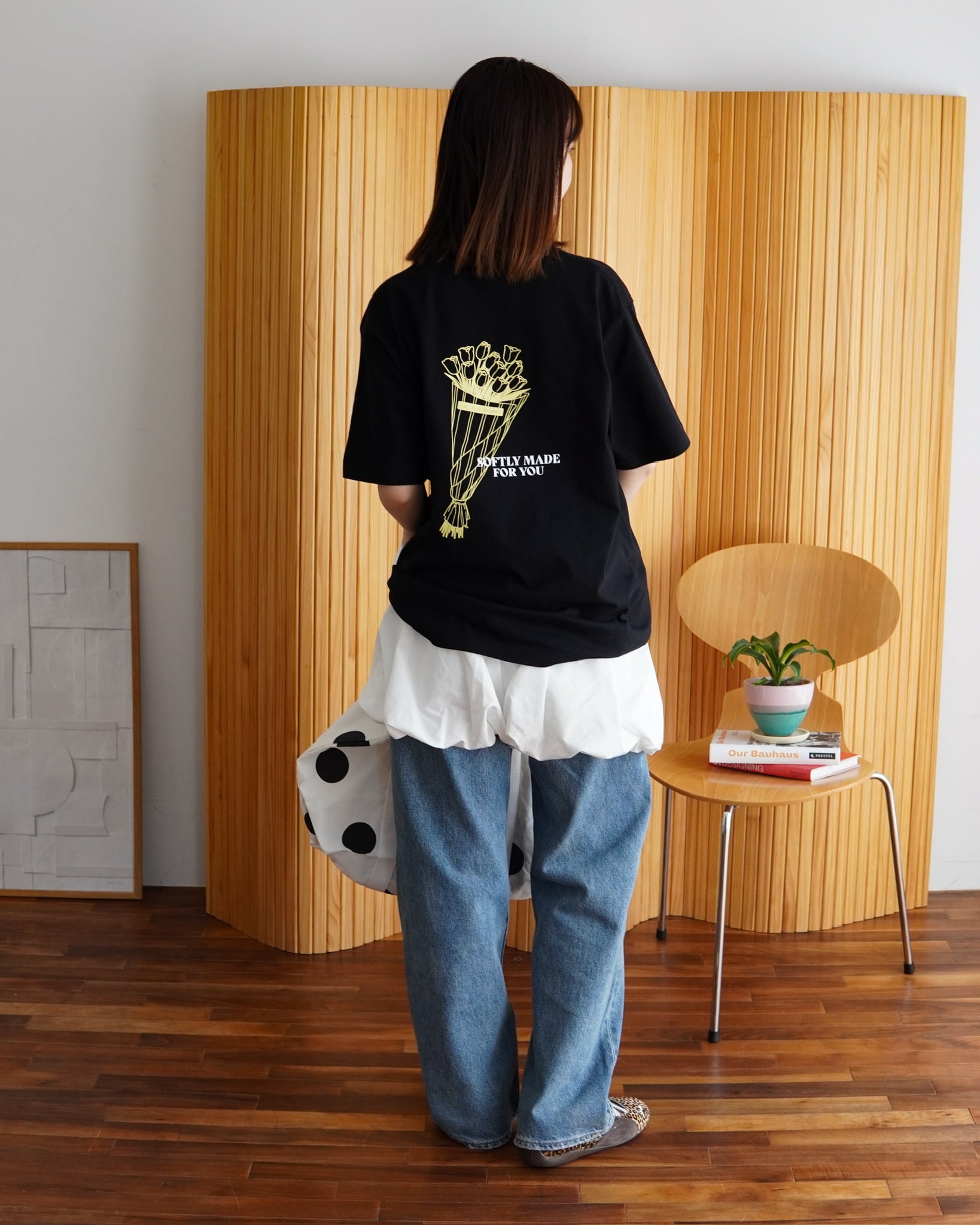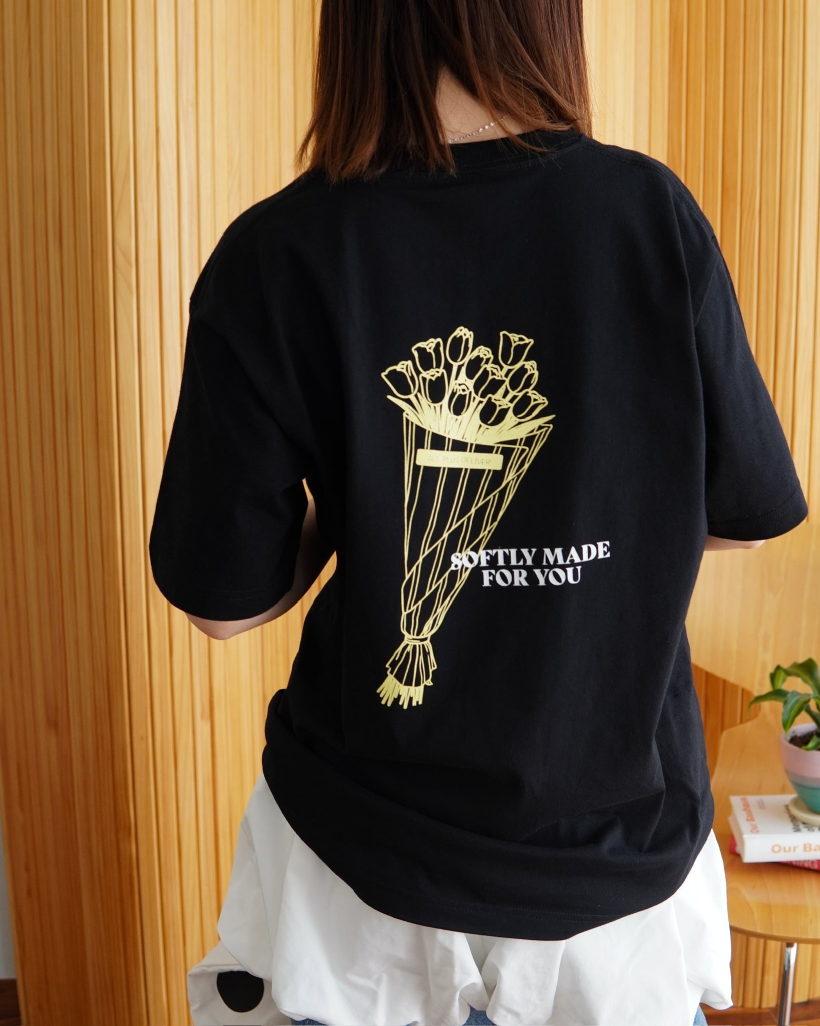 背面に大きく描かれたチューリップのブーケは、日常の中でそっと気分を整える“やさしい存在”として表現。繊細なラインで描くことで、主張しすぎない柔らかな印象に仕上げています。