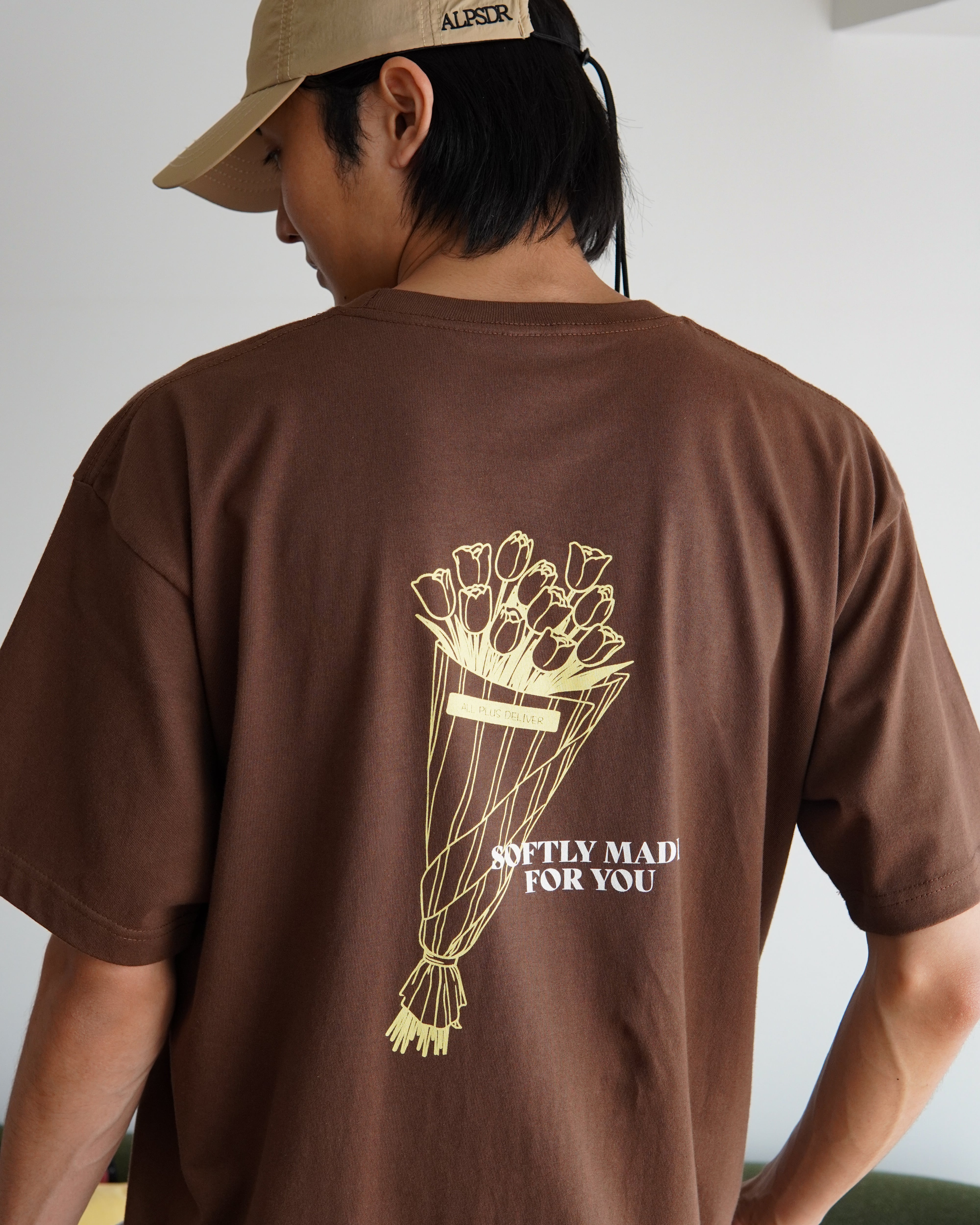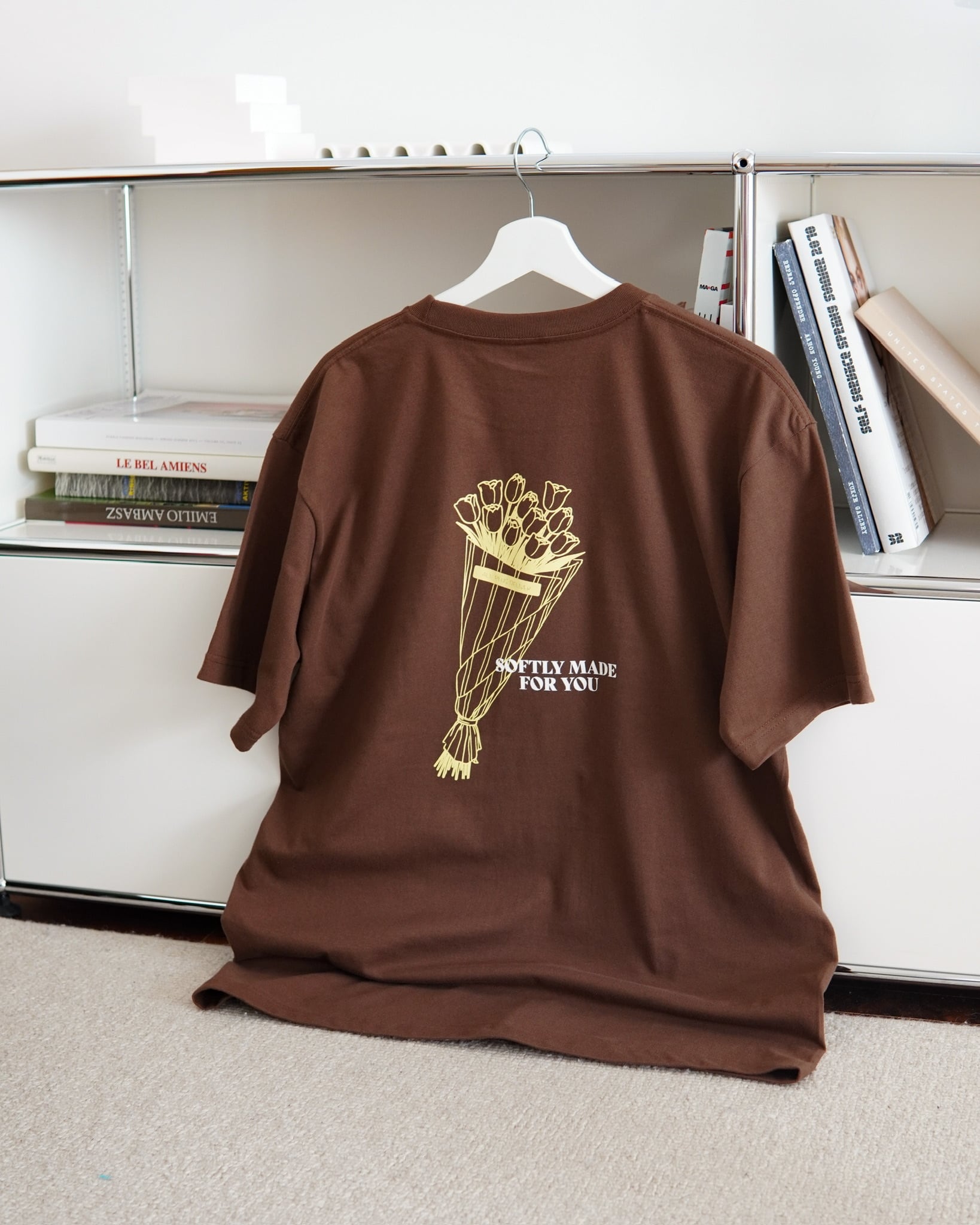 背面に大きく描かれたチューリップのブーケは、日常の中でそっと気分を整える“やさしい存在”として表現。繊細なラインで描くことで、主張しすぎない柔らかな印象に仕上げています。