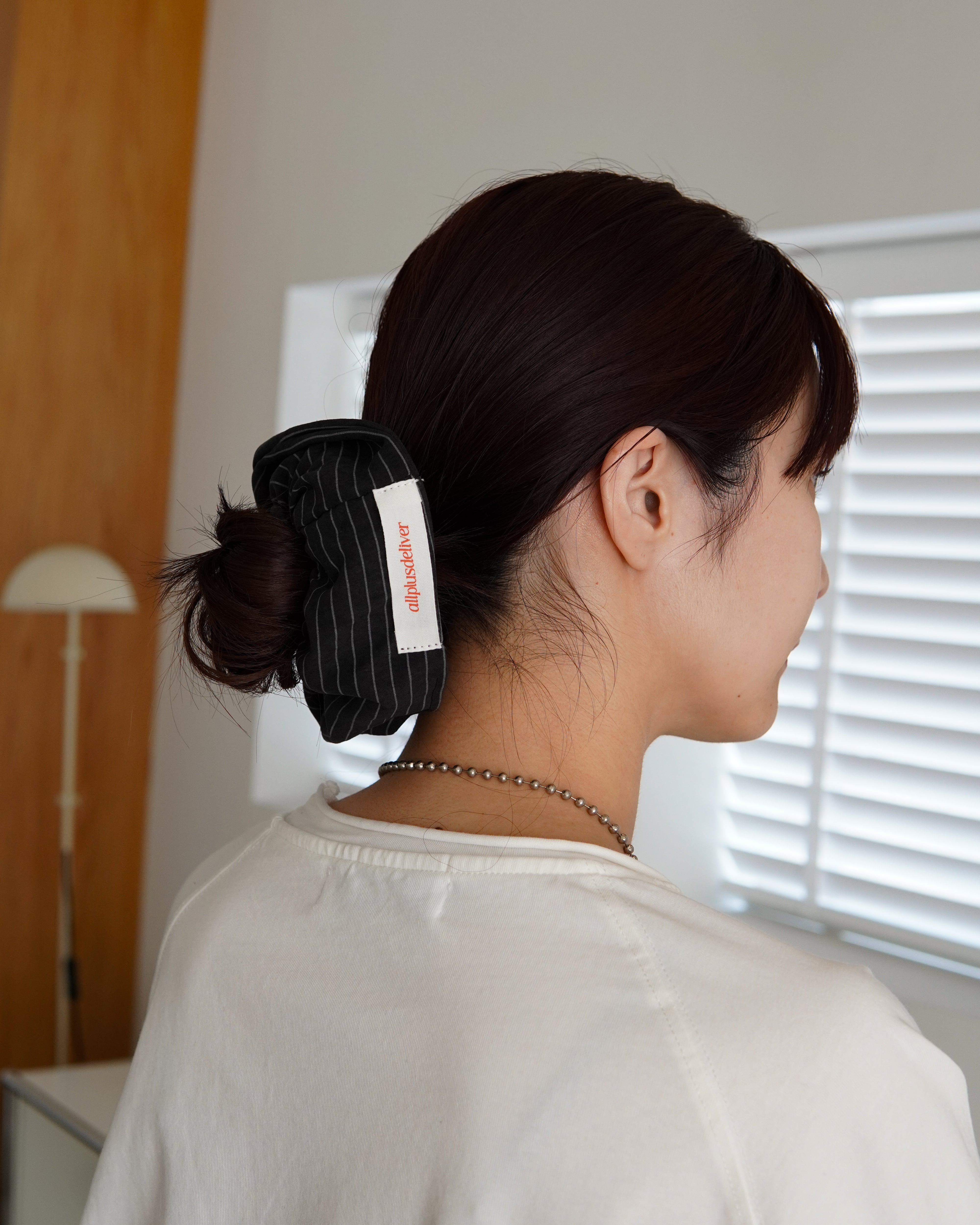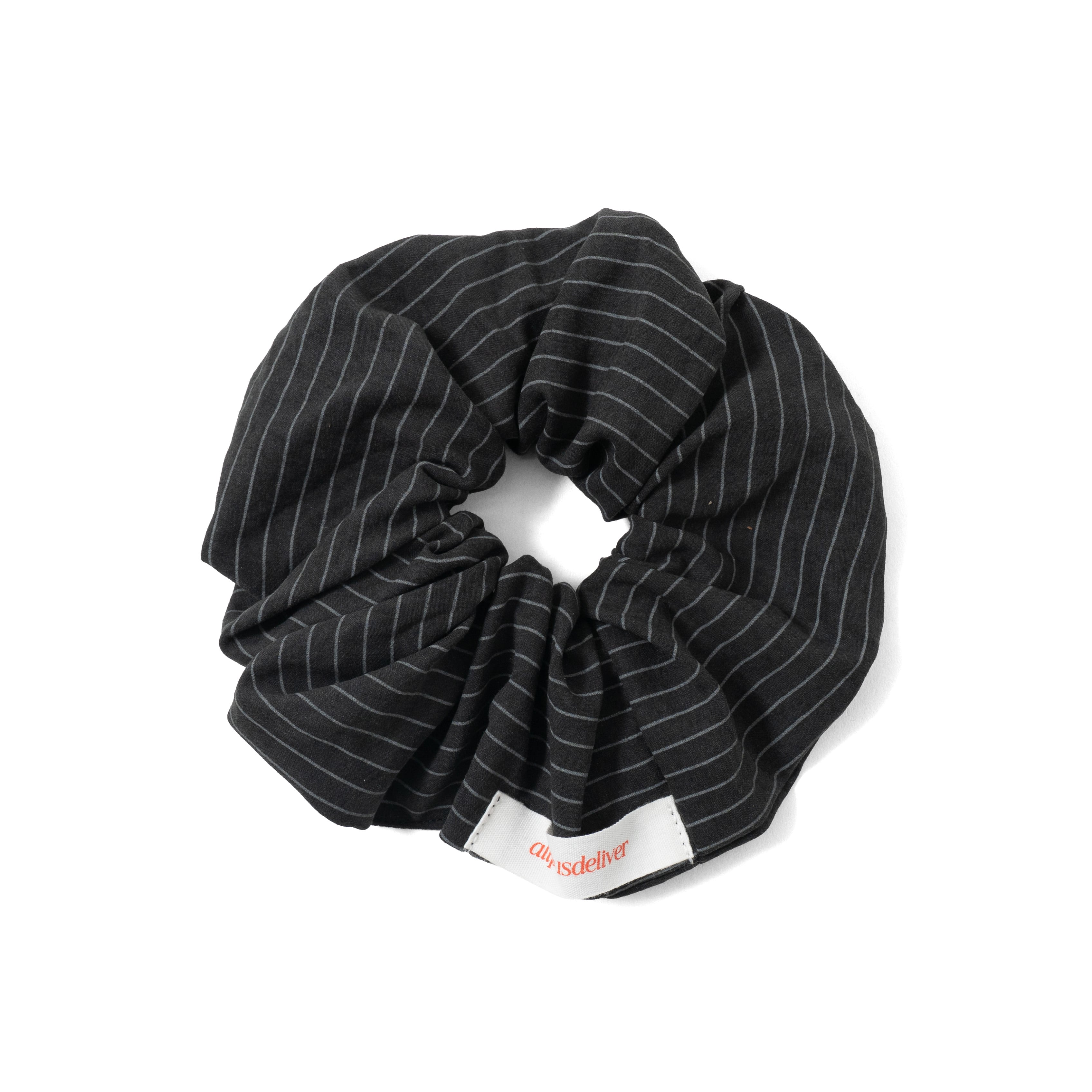 ストライプ柄にブランドタグを落とし込んだシュシュ。