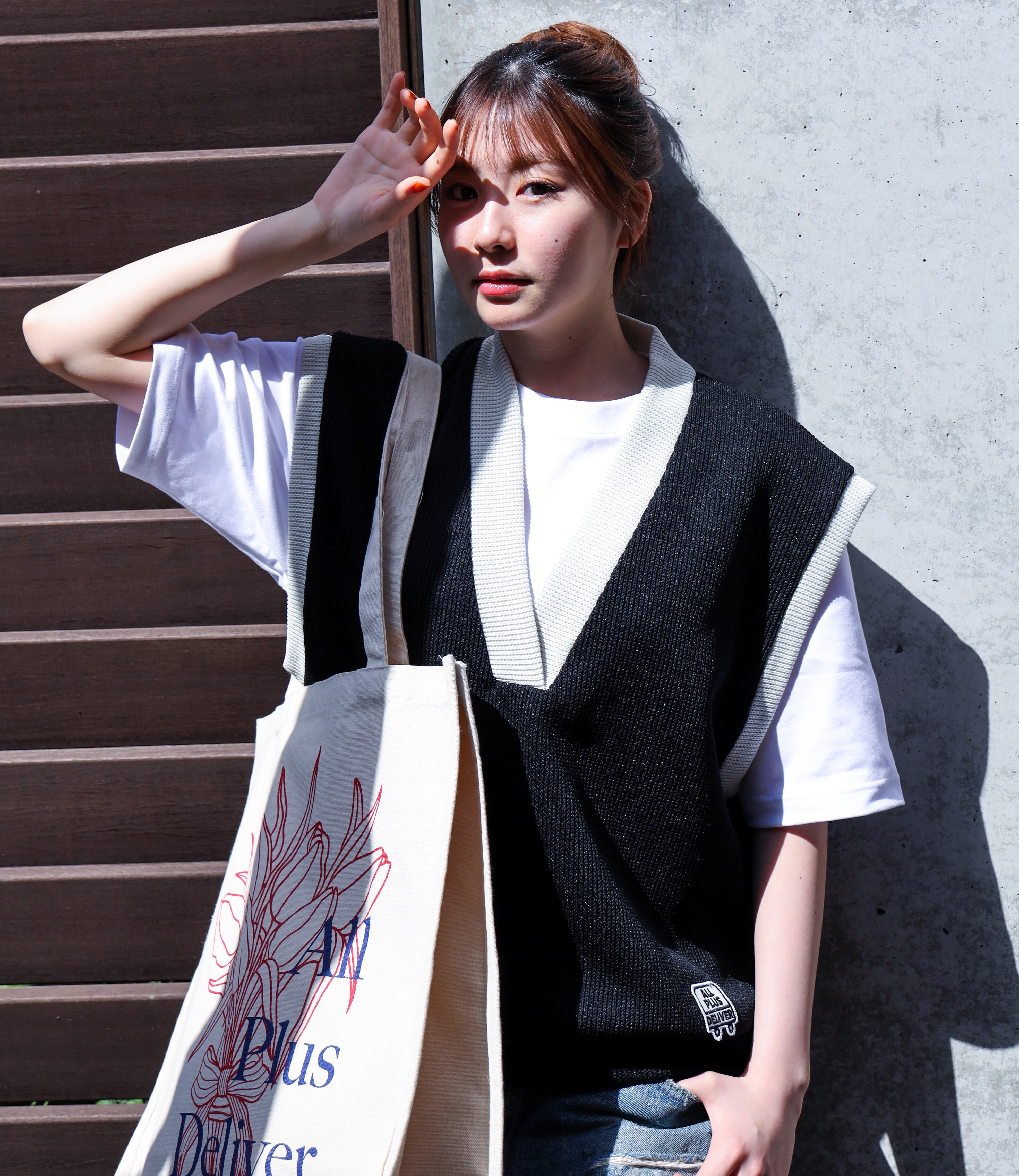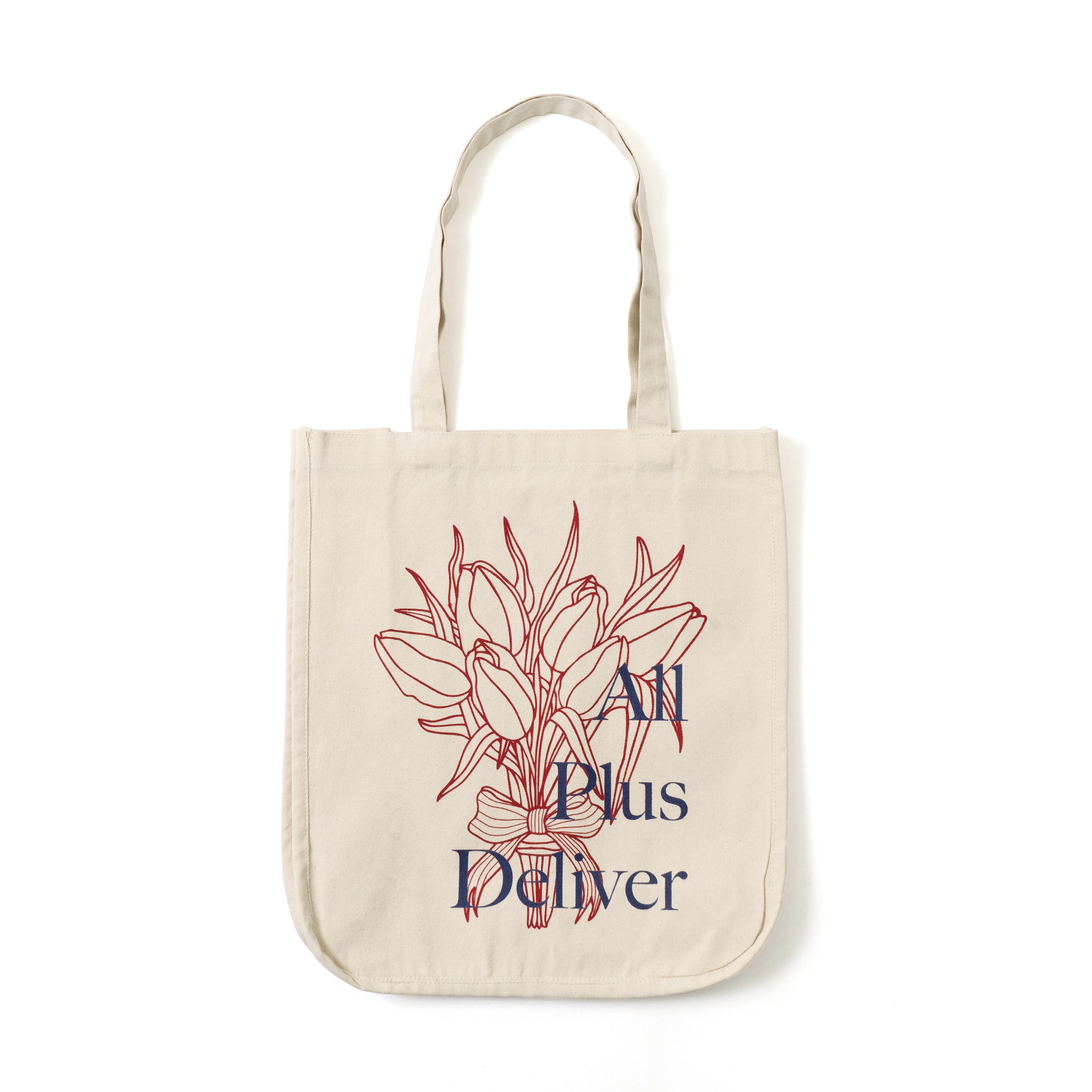 チューリップのグラフィックとブランドネームのプリントを落とし込んだ大容量のトートバックです。カジュアルさと上品さを兼ね揃え、その日のコーディネートに合わせて両面の使い分けが可能です。内側には収納ができるように大きいポケットが付いています。