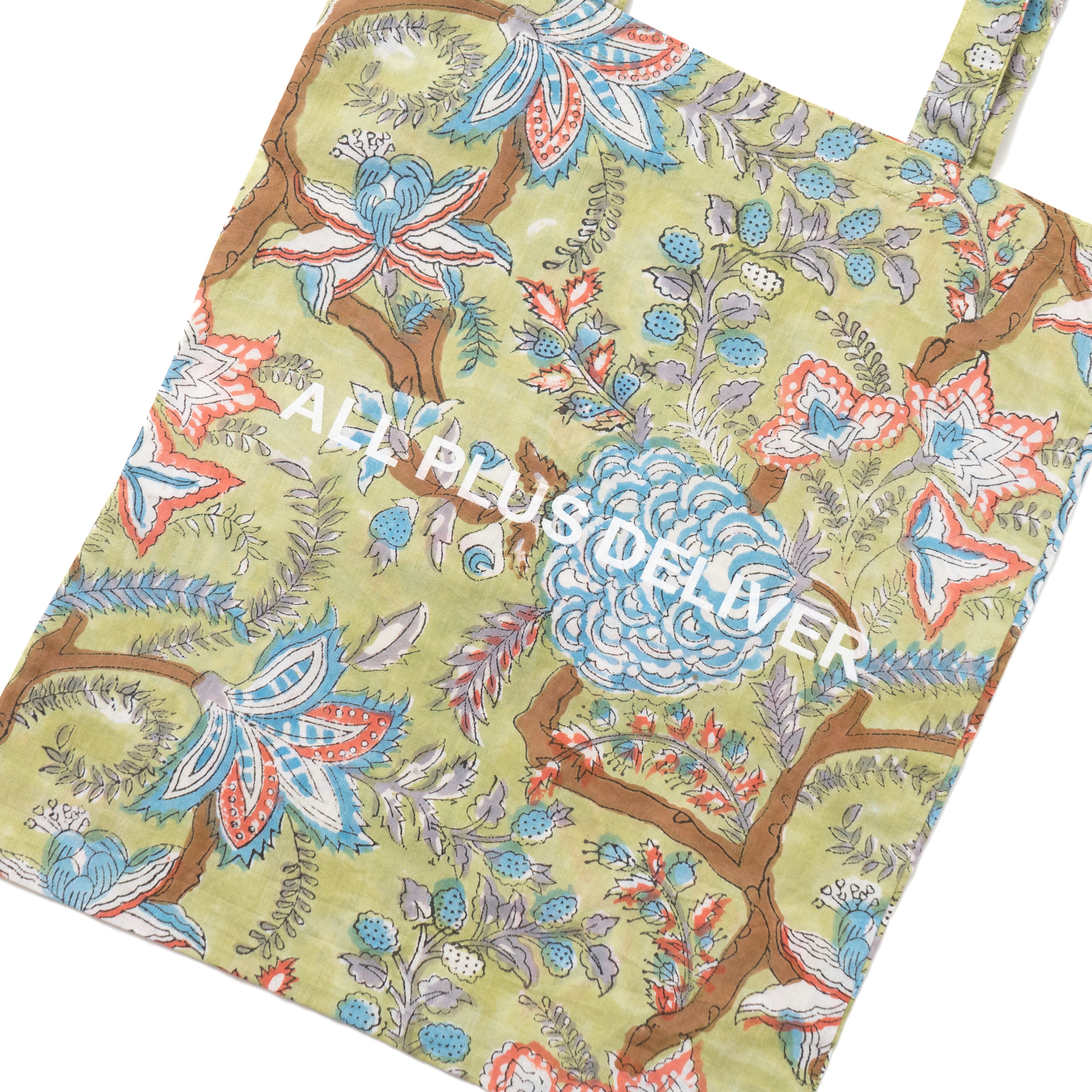 全面に花柄が施されたトートバック。両面にはブランドネームをプリントで落とし込みました。