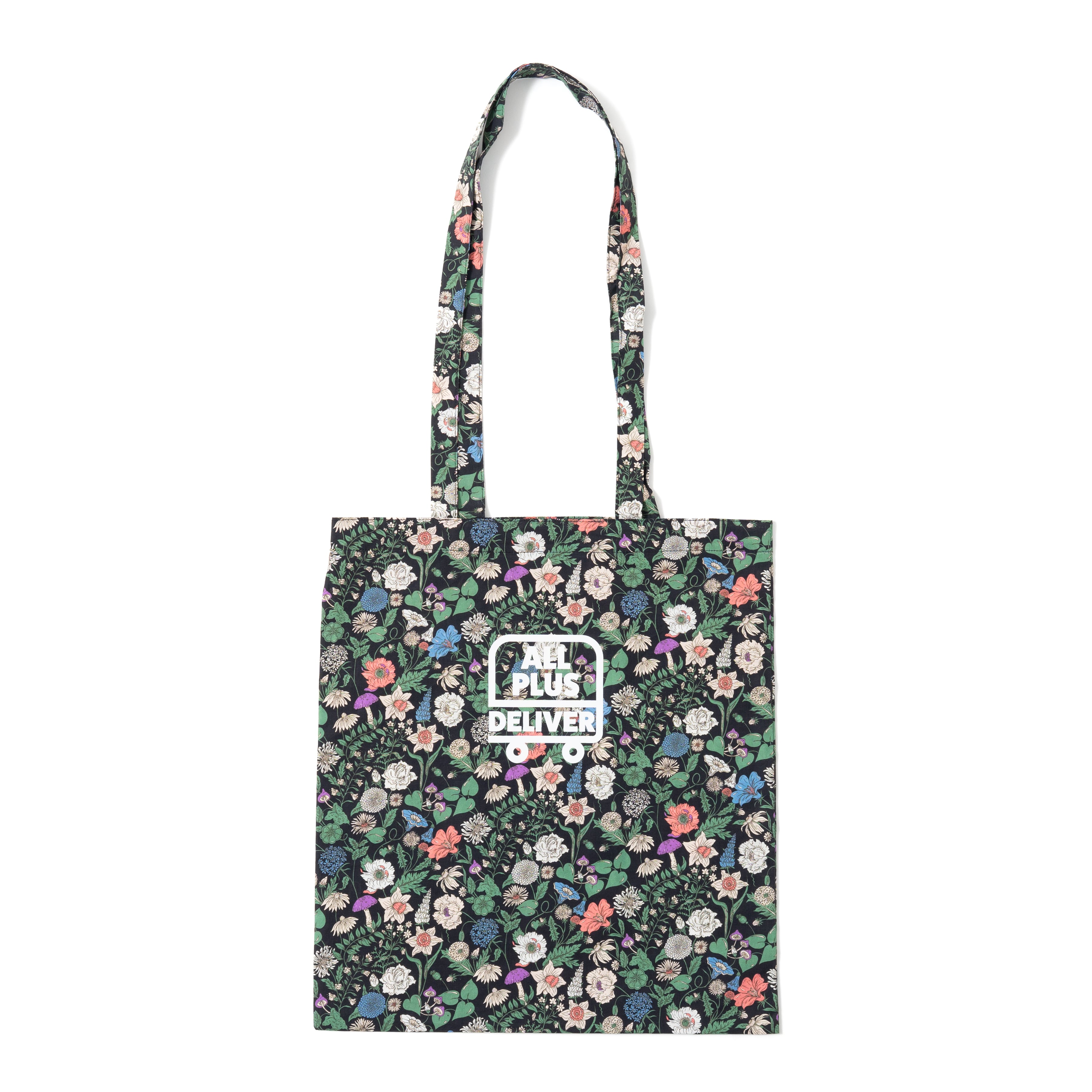 全面に花柄が施されたトートバック。両面にブランドロゴをプリントで落とし込みました。